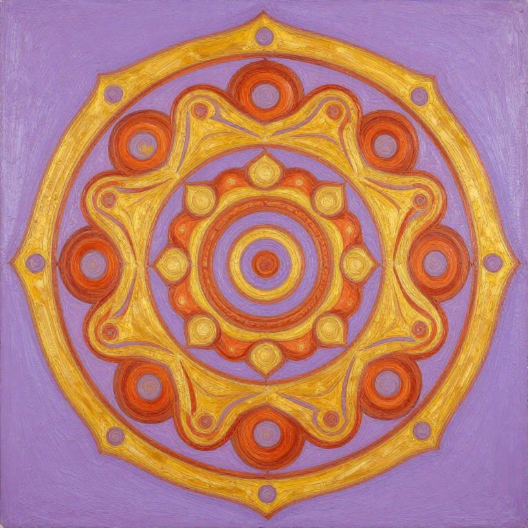 "Retro Trends Abstract painting of wheel of fortune with swirls, circles, and hexagons with the colors of lavender, golden yellow, and rust orange in silk in a Surrealist style of Indian rangoli.,"