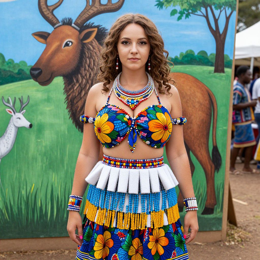A woman in her late 20s with curly brown hair and a serene face wearing an elaborate Ndebele-inspired costume from South Africa, consisting of bright floral patterns and a layered skirt made of cotton and beads, standing in front of a painted mural of African wildlife in a cultural festival setting in Pretoria.. The woman has big tits and cute face