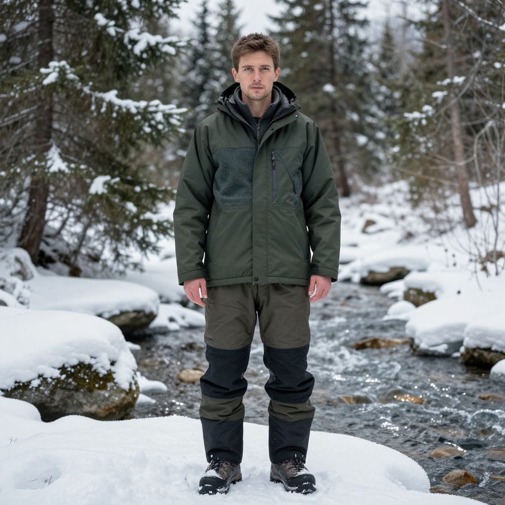A man, insulated waterproof jacket, breathable fleece mid-layer, thermal insulated pants, black snow gaiters, rugged hiking boots, dark green color scheme, snow-dusted evergreens, frozen stream glistening, quiet, serene atmosphere, pinhole camera style, contemplative expression. Man has masculine face and piercing eyes