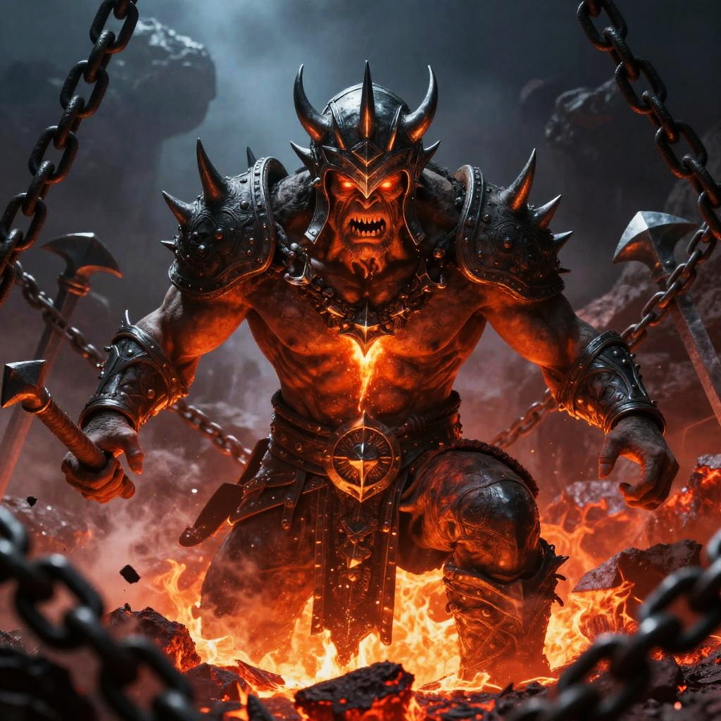 Malacath, the harsh orc god of justice and retribution, shown emerging from volcanic lava flows, his spiked iron helmet reflecting molten light, eyes blazing with fury, surrounded by shattered chains and broken weapons, a scene charged with raw power and mythic intensity.