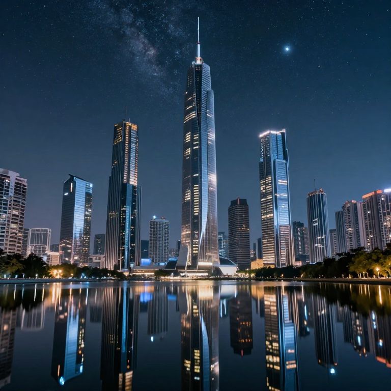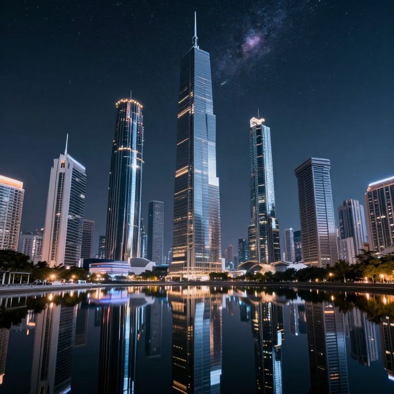 Photograph of a city skyline at night, featuring tall, modern skyscrapers with illuminated windows reflecting on a calm, dark body of water in the foreground. The central skyscraper has a distinctive, pointed spire. The buildings are lit with blue and white lights, creating a vibrant contrast against the dark, starry sky. The Milky Way is visible, adding a cosmic element. Trees line the water's edge, with small, warm yellow lights providing additional illumination. The overall scene is serene yet dynamic, capturing the blend of natural and urban elements.