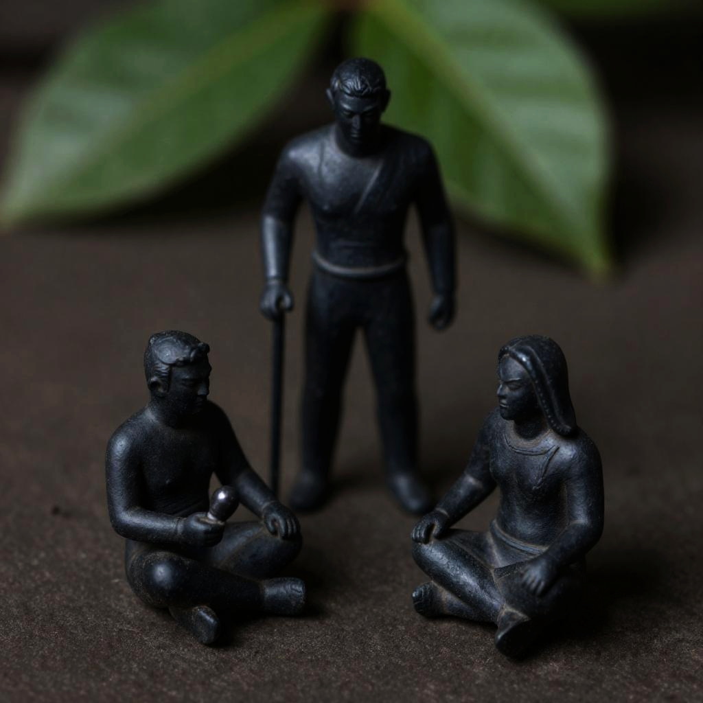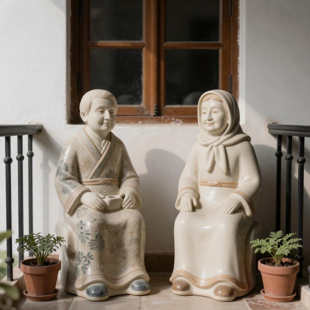 Photograph of two elderly ceramic figurines on a balcony. Both wear patterned clothes and headscarves, sitting with hands on laps. Left figure holds an object. Balcony has black railing, small potted plants, and table with items. Sun casts shadows. Window in background. Figurines have calm expressions.