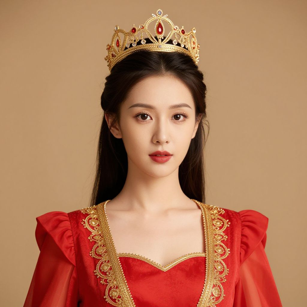 A woman in a red and gold outfit with a crown on her head.
