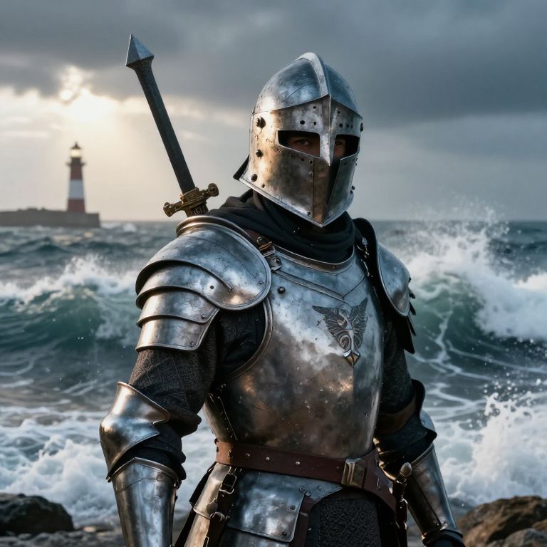 Photograph of a medieval knight in shiny steel armor with a sword on his back, standing on a rocky beach with crashing waves and a lighthouse in