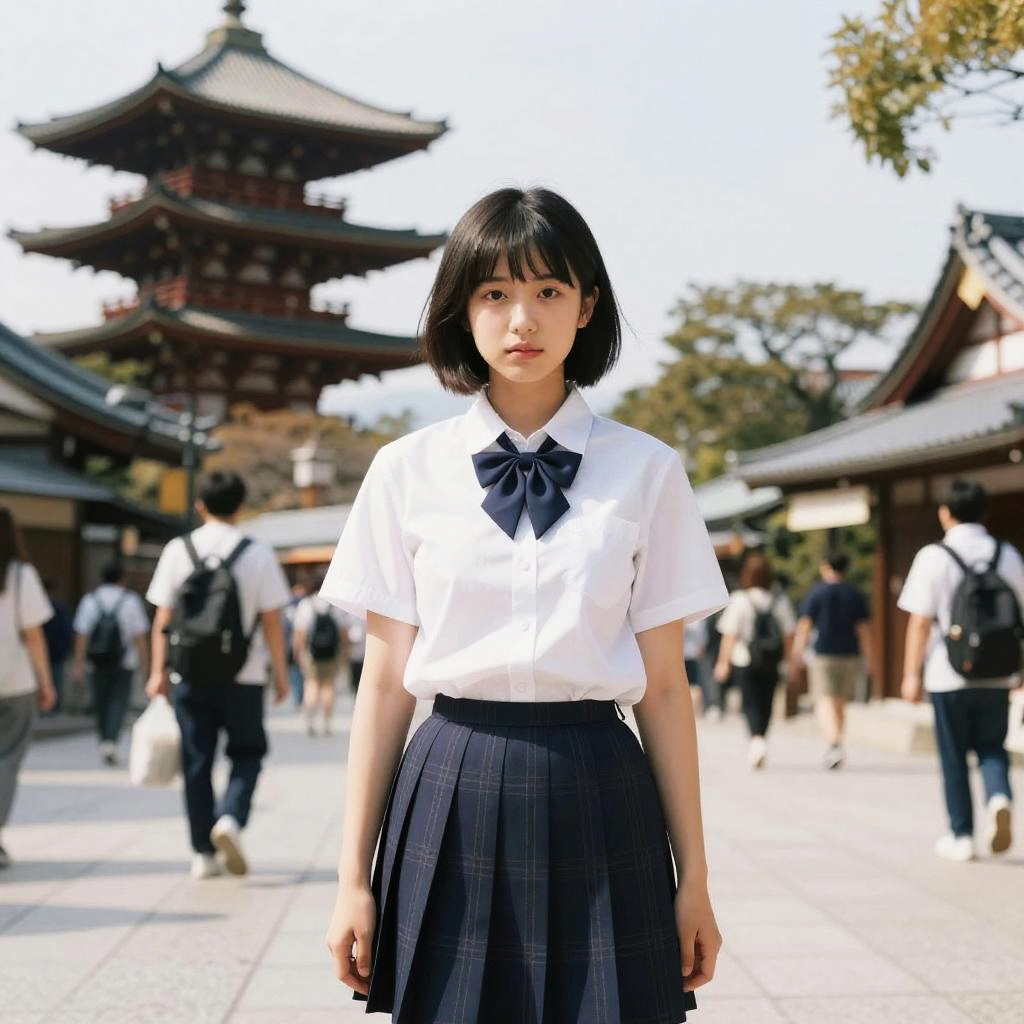 Photograph of an Asian woman with short black hair, wearing a black dress with white collar, black hat, holding shopping bags, smiling, walking in