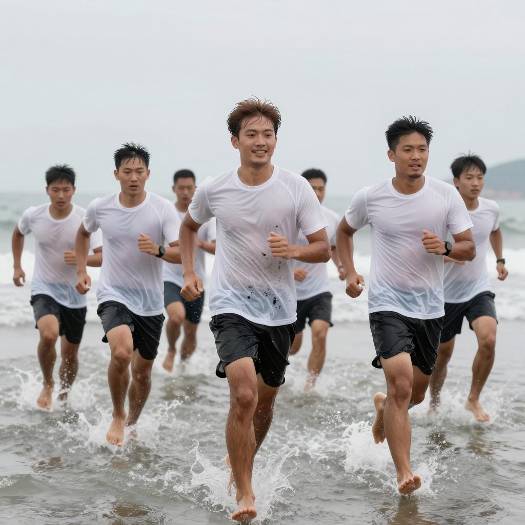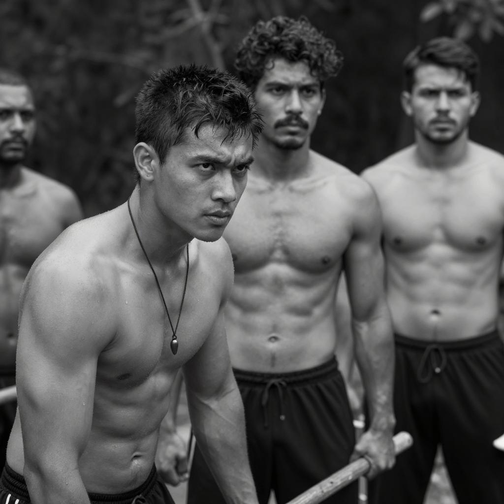 Shirtless men in swim trunks stand on sandy beach with rocky background. One man with black fur holds green surfboard. Another man in blue polka-dot trunks faces group. Red and white striped tent on left. Group of men, mostly shirtless, watch intently. Total 8 people. Sunlight highlights muscular backs and beach setting.