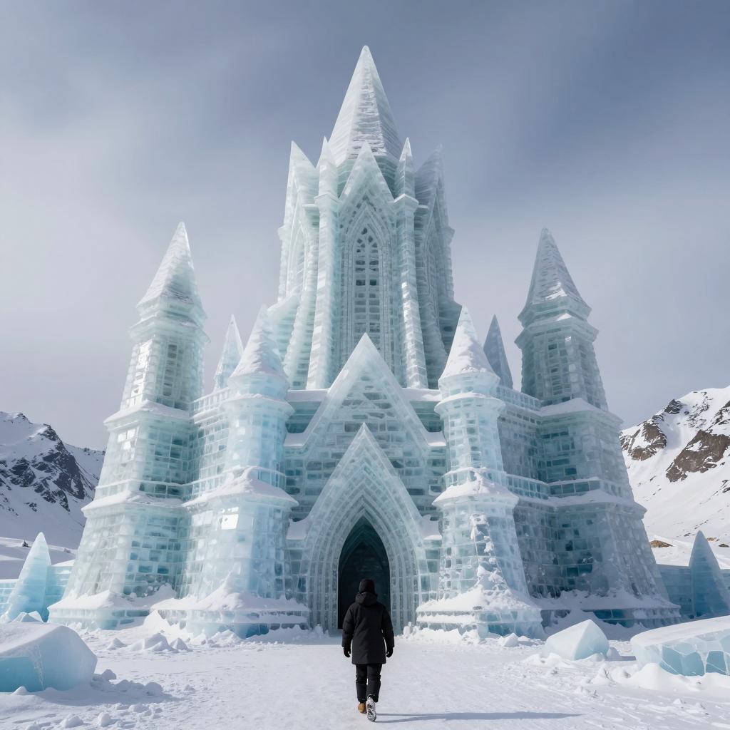 A towering ice castle with sharp crystal-like formations stands amid a vast snowy mountain landscape under a moody sky. A solitary figure wearing winter gear approaches the entrance, highlighting the immense scale and eerie atmosphere of the frozen fortress.
