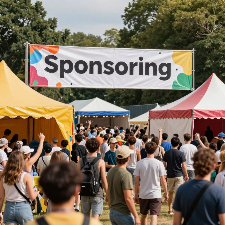 Sponsoring event banner at a vibrant outdoor festival, colorful tents and enthusiastic crowd, dynamic energy, bright sunlight, detailed and immersive scene, modern festival aesthetics, lively and engaging atmosphere