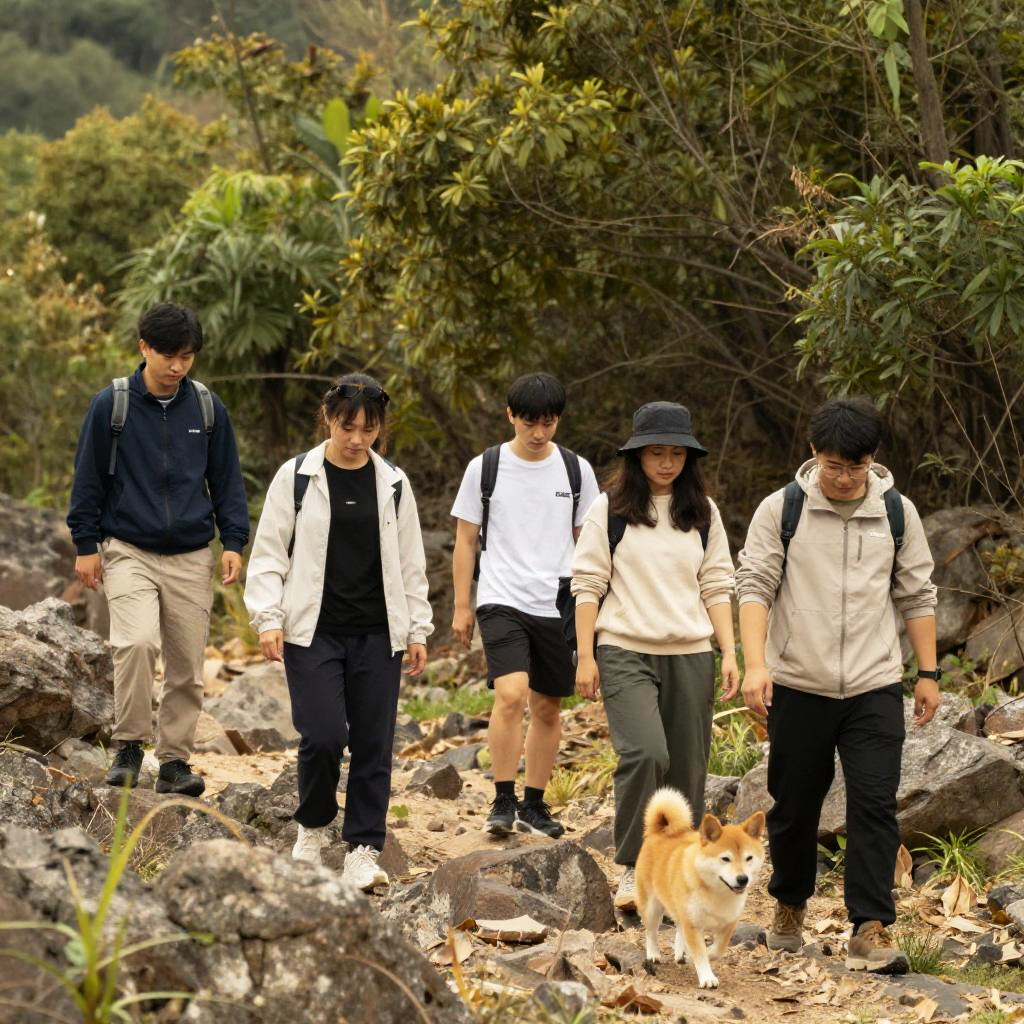 A group of five joyful young Asian adults taking a selfie outdoors near a river surrounded by lush green trees and natural landscape. The group consists of three men and two women, all casually dressed in colorful t-shirts (white, blue, yellow) and wearing glasses. The photo captures bright daylight and an energetic, friendly atmosphere with clear detailed faces and natural light illuminating the scene.