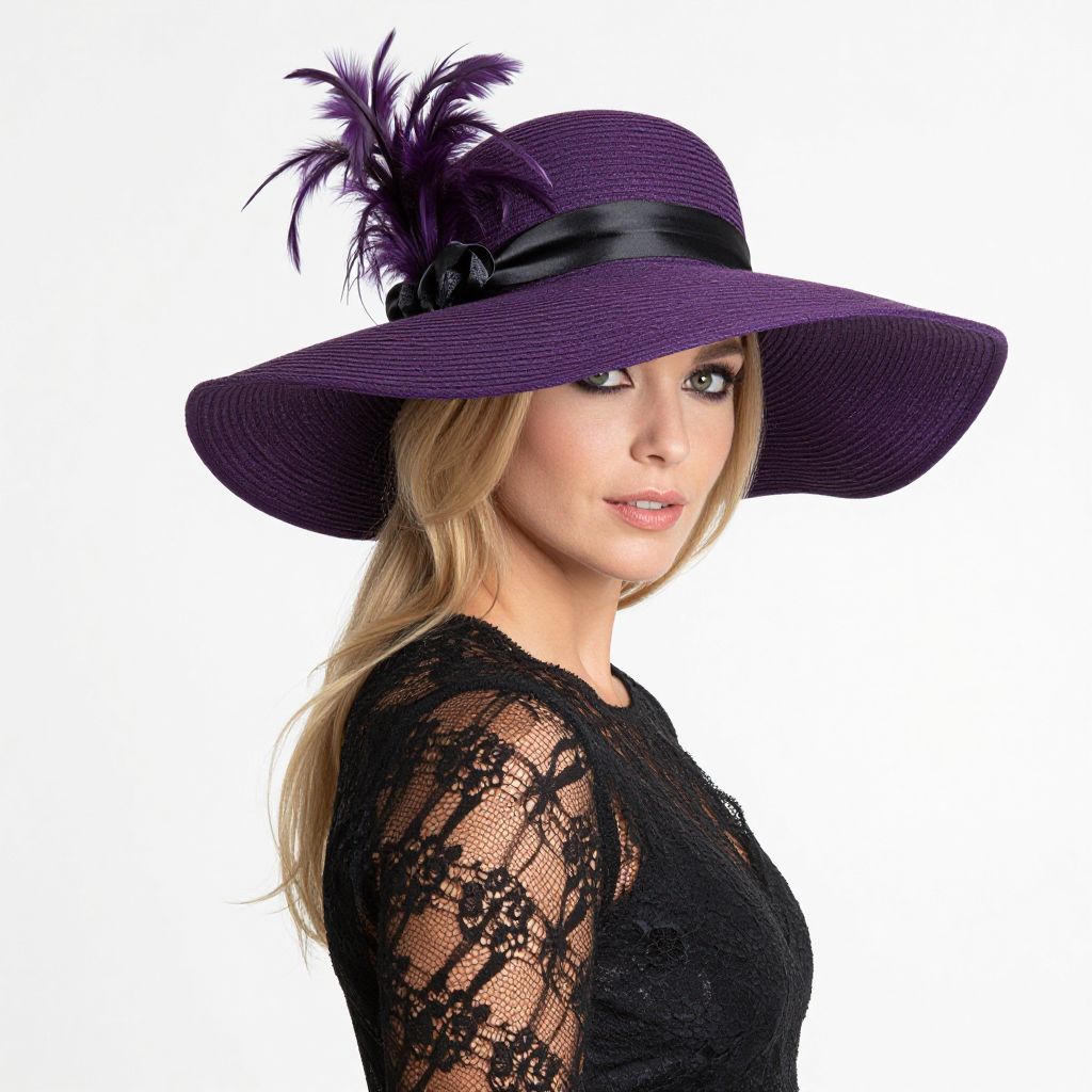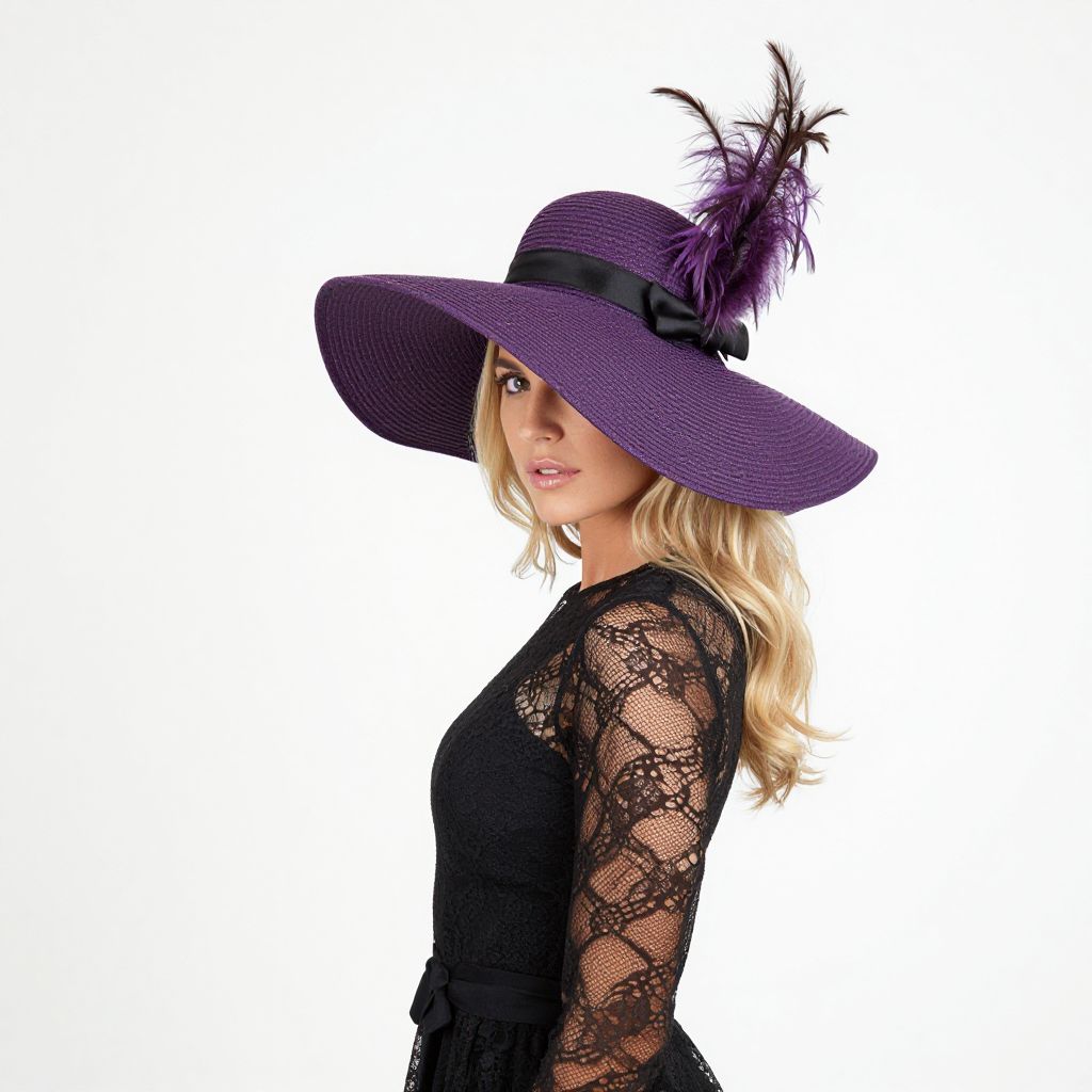 Blonde woman wearing a wide-brimmed plum hat adorned with cascading purple feathers and a black ribbon, paired with a lacey black dress, stands gracefully against a clean white background.