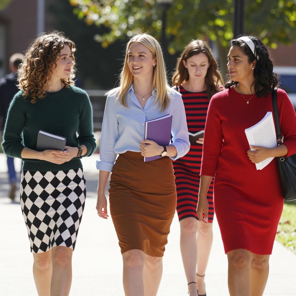 Four women walking outdoors, sunlight. Woman on left with curly brown hair, dark green sweater, black-and-white diamond skirt, holding book. Center woman with straight blonde hair, light blue shirt, brown skirt, holding purple book. Woman on right with dark hair, white headband, red sweater dress, black handbag, holding papers. Background woman with brown hair, red-and-black striped dress, walking away. Greenery, trees in background. Bright daylight, smiling expressions. Casual, academic attire.
