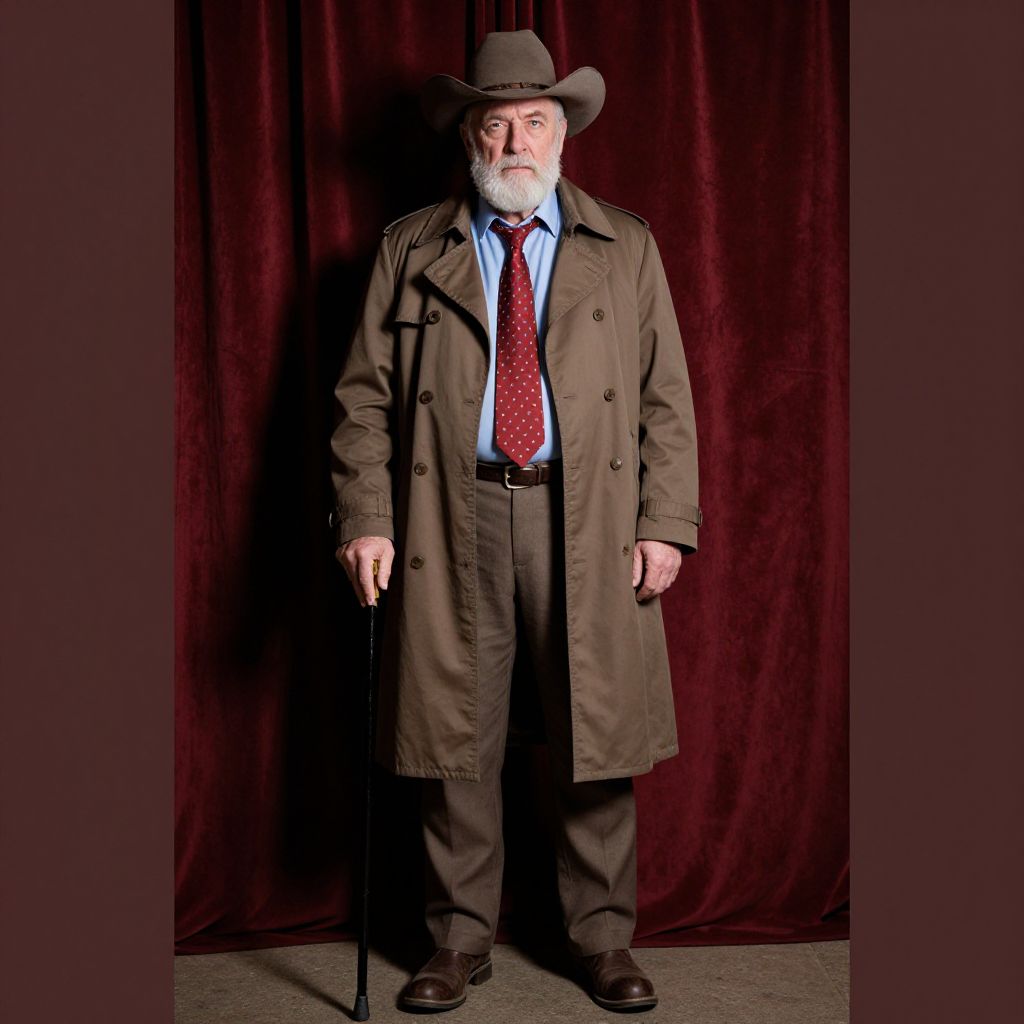 Photograph of an older white man with a full white beard and serious expression, standing against a dark red curtain. He's wearing a brown cowboy hat, brown trench coat, light blue shirt, red tie with white dots, brown pants, and brown boots. He holds a black cane in his right hand, and the lighting creates a dramatic, shadowy effect.
