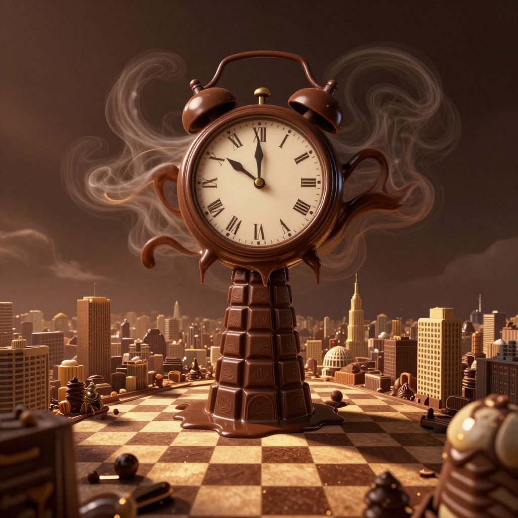 A whimsical dreamscape where a colossal chocolate tower stands sentinel over a checkerboard cityscape below, casting long, syrupy shadows across the landscape. This surreal vista invites the viewer to look up from beneath its towering presence with a sense of wonder and curiosity akin to that of an insect or fairy tale character. The color palette is rich and indulgent, dominated by deep browns and warm golds reminiscent of childhood sweets and chocolate's decadence. The clock face morphs into swirling mists and abstract shapes, blurring the boundary between time and imagination and creating a fantastical atmosphere that feels simultaneously familiar and otherworldly.