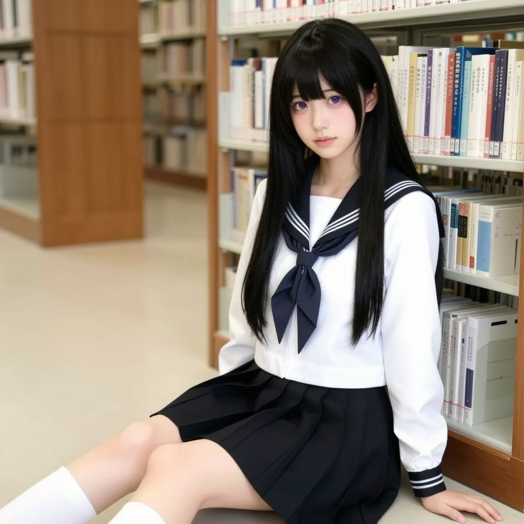 This is a digital anime-style drawing of a young woman with long, black hair and blue eyes, sitting on the floor of a library. She wears a white sailor-style blouse with a black necktie, a black pleated skirt, and white socks. Her legs are bent with one knee raised, exposing her thighs. The background features tall bookshelves filled with books, illuminated by soft, warm light. The woman has a slightly shy expression, with a gentle blush on her cheeks. The floor is wooden, adding a rustic touch to the setting.