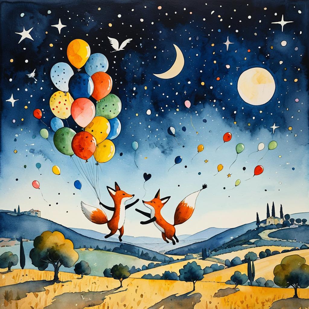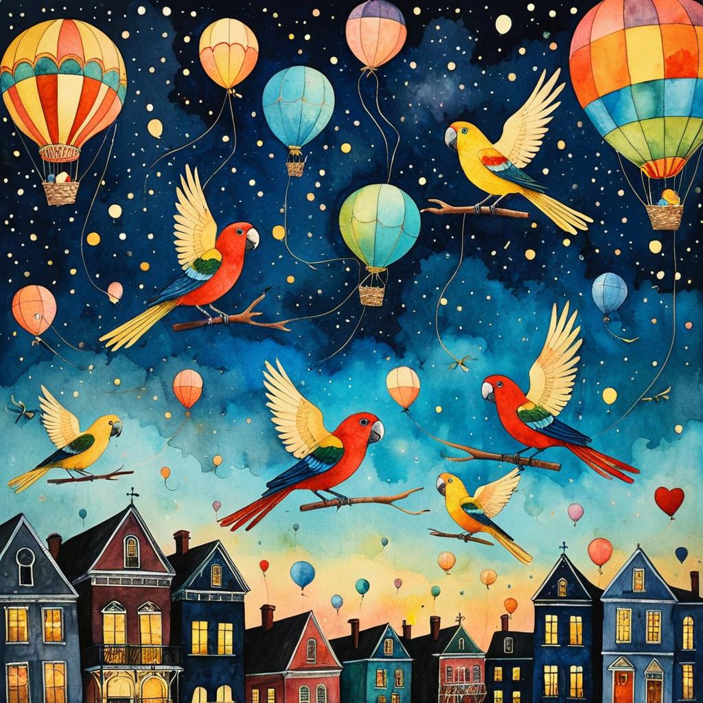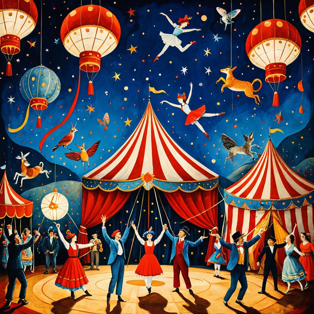 Watercolor Painting in playful primitive surrealist Paul Klee style, a circus parade with whimsical animals and acrobats, above Kenya, whimsical, dreamy atmosphere, soft glowing lights, enchanting night sky, infused with magic and love, angels, winged cats