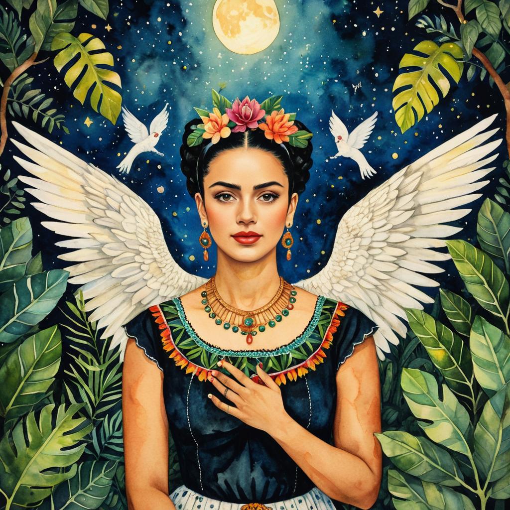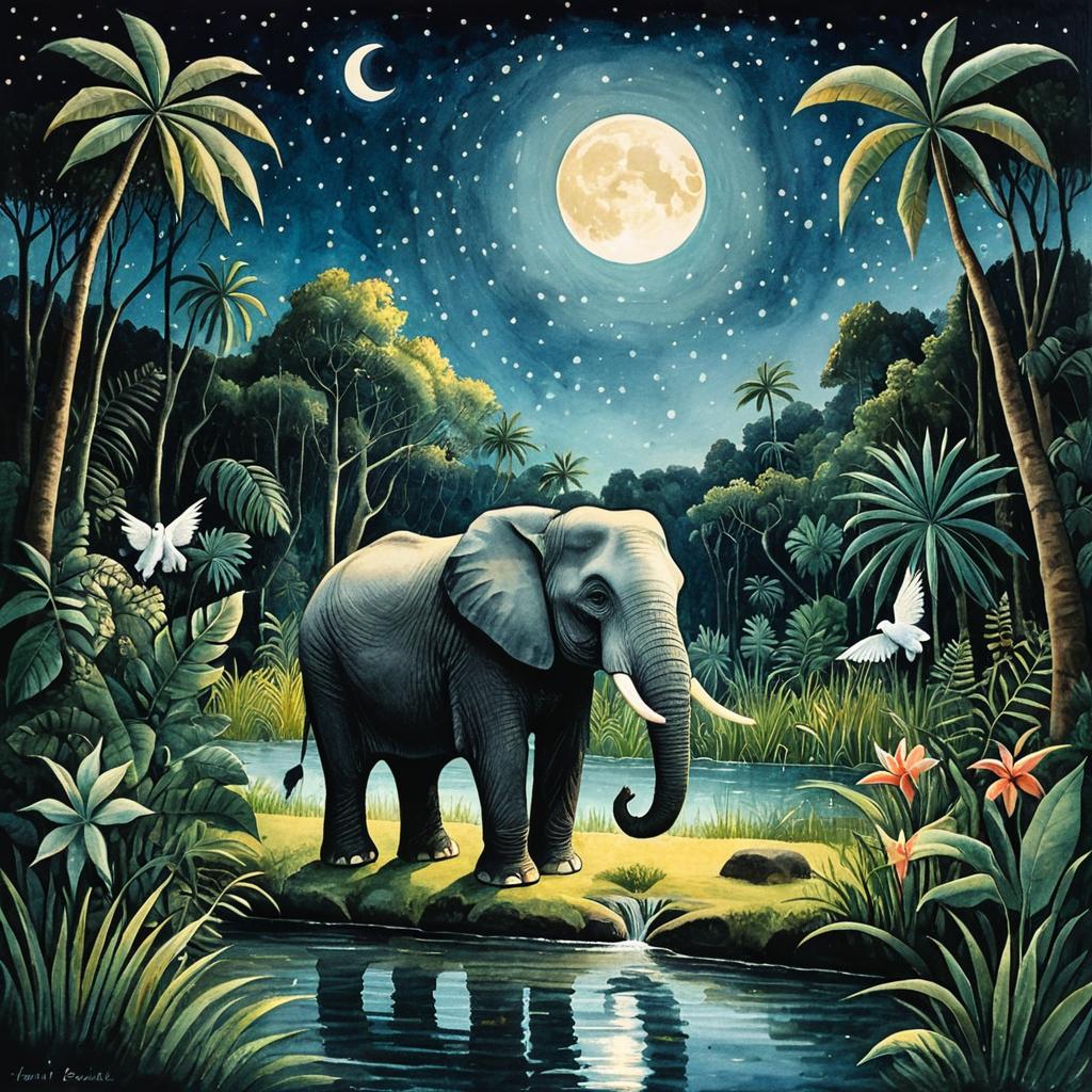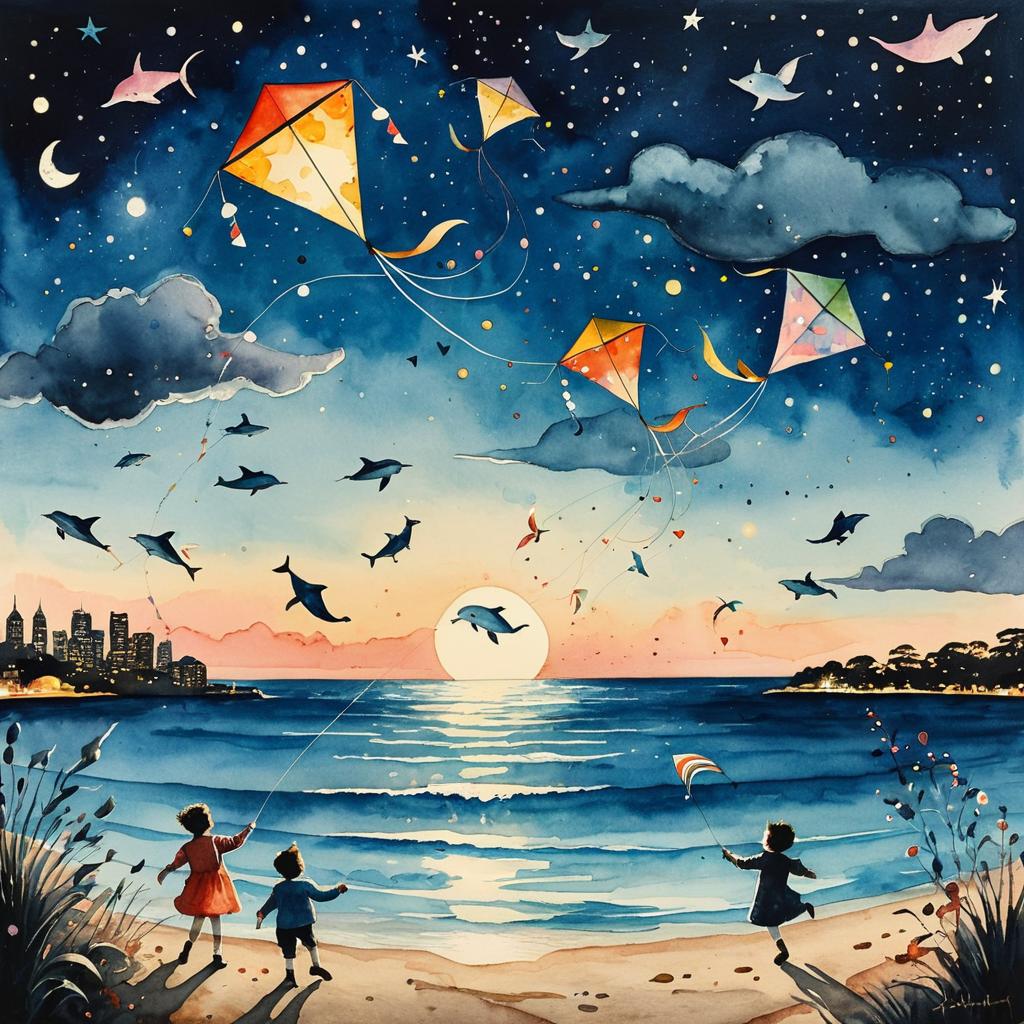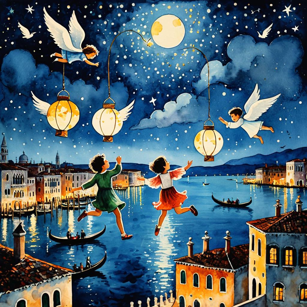 Watercolor Painting in playful primitive surrealist Paul Klee style, a circus parade with whimsical animals and acrobats, above Kenya, whimsical, dreamy atmosphere, soft glowing lights, enchanting night sky, infused with magic and love, angels, winged cats