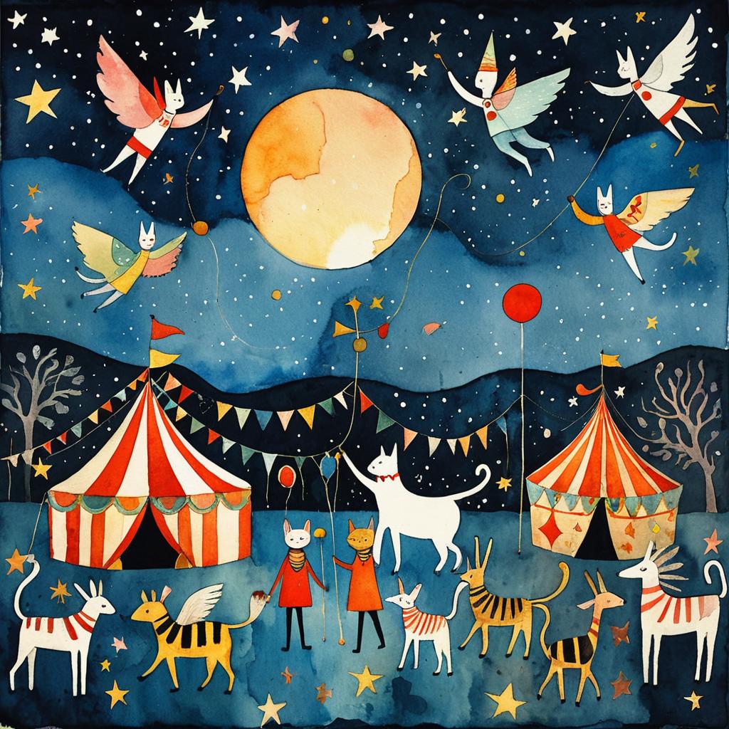 Watercolor painting of a surreal circus parade featuring whimsical animals including cats and a dog with striped patterns, acrobats, angels with wings, and colorful circus tents under a magical and dreamy night sky filled with stars, moons, and soft glowing lights. The illustration showcases a playful primitive surrealist style inspired by Paul Klee, with a fantasy atmosphere infused with magic and love.