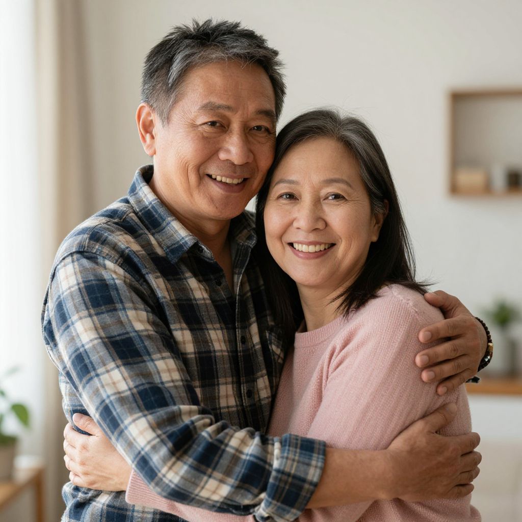 Photograph of smiling elderly Asian couple hugging in a warmly lit living room; man in blue plaid shirt, woman in pink sweater.