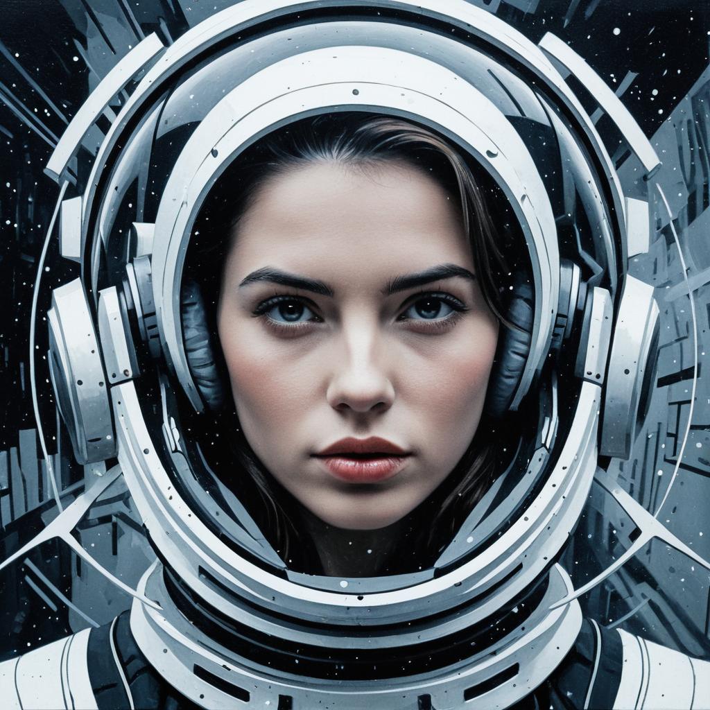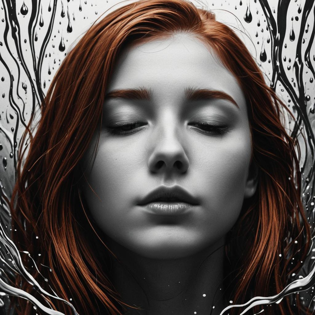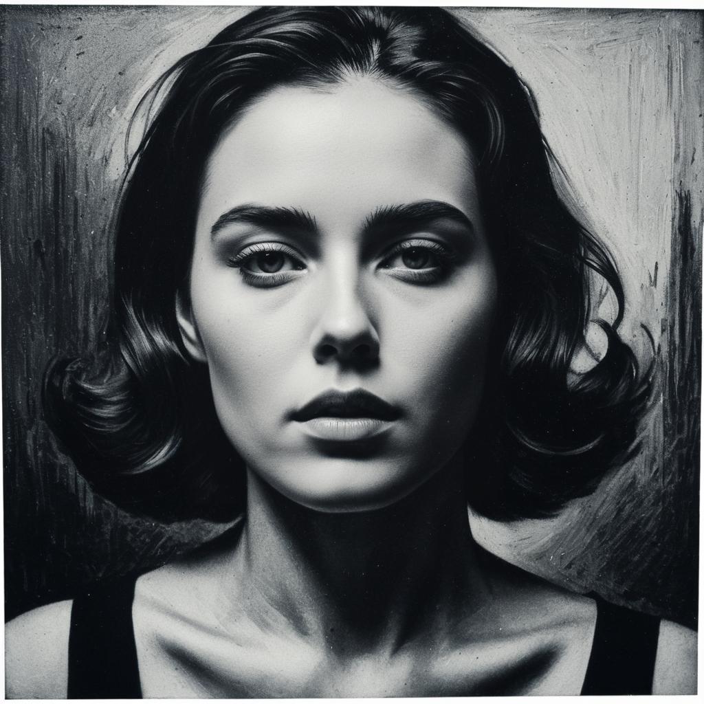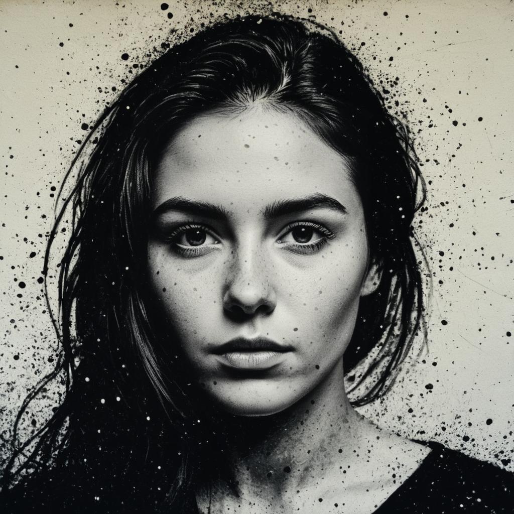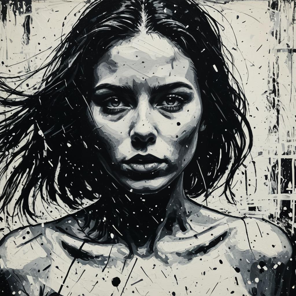 Black and white portrait painting of a young woman featuring a close-up of her face with intense gaze and flowing hair. The artwork incorporates splattered and textured details, characteristic of symbolism art style.