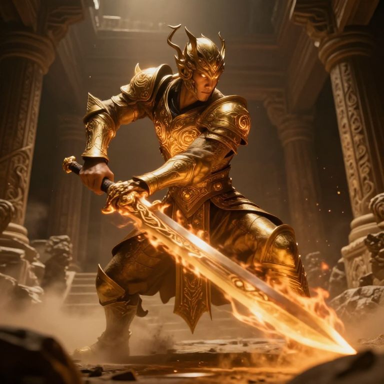 Photorealistic digital art depicting a muscular, armored warrior with a horned helmet, poised in a dynamic stance. He wields a glowing, fiery sword with intricate designs, illuminating the dimly lit, ancient temple setting. The warrior's golden armor is ornate, with swirling patterns and embossed details, reflecting light. Tall, weathered columns frame the background, and smoke or dust clouds the floor, adding a sense of movement and danger. The image has a dramatic, epic feel, with intense lighting and shadow contrasts.