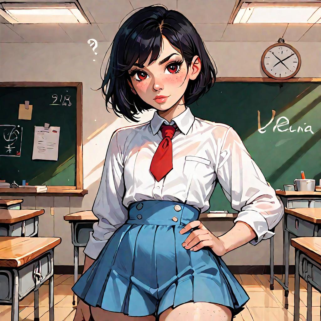 Score_9, score_8_up, score_7_up, score_6_up, score_5_up, score_4_up, classroom, front view, looking at viewer, raised eyebrow, confused, black eyes, white pupils, freckles, female, human, black hair, short hair, swept bangs, flat chested, thick thighs, standing, white formal shirt, blue skirt, red necktie, black thigh highs