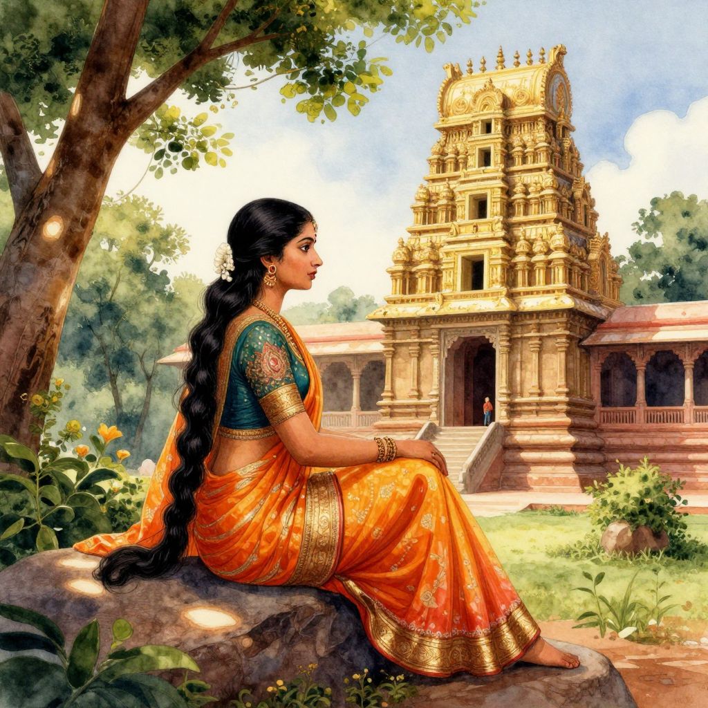 In this captivating watercolor painting by Raja Ravi Varma, the serene atmosphere of India's ancient temples is beautifully captured. A woman, adorned in traditional Indian attire, sits contemplatively on a rock, her long hair cascading down her back. The intricate details of her clothing, including the vibrant sari and delicate jewelry, are rendered with meticulous care. The temple in the background, with its ornate carvings and towering pillars, stands majestically, its golden hues contrasting with the lush greenery of the surrounding foliage. The interplay of light and shadow, created by the play of sunlight filtering through the trees, adds depth and dimension to the scene. The overall composition, with the woman positioned in the foreground and the temple in the background, creates a sense of tranquility and spiritual peace, inviting the viewer to join in the moment of meditation and reflection.