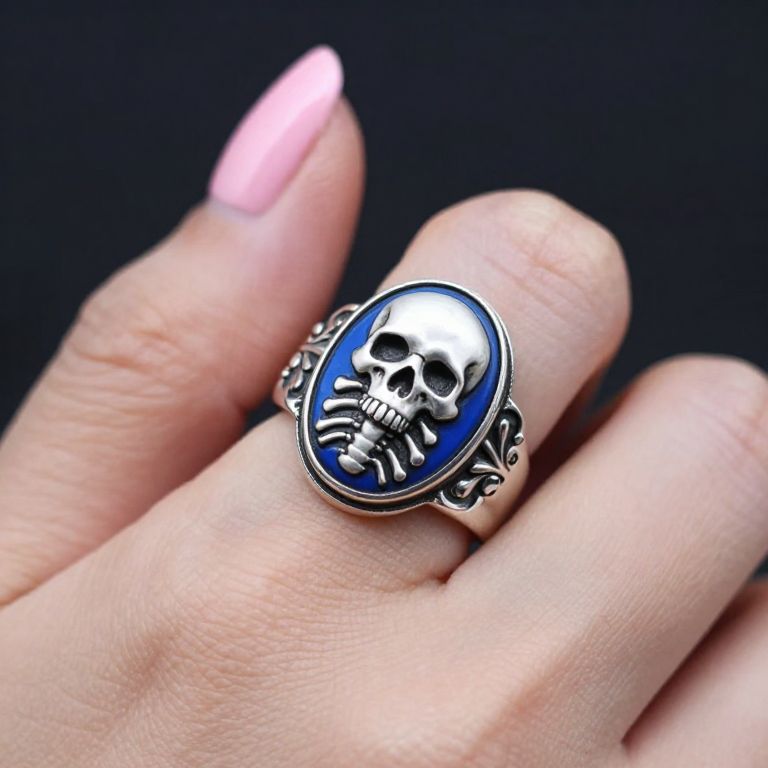 A close-up photo of a hand with light skin and pink-painted nails holding a silver ring. The ring features a detailed white skull and ribcage design against a blue oval background, surrounded by ornate silver patterns. The image has a dark, slightly blurred background that contrasts with the shiny ring and the hand's soft texture.