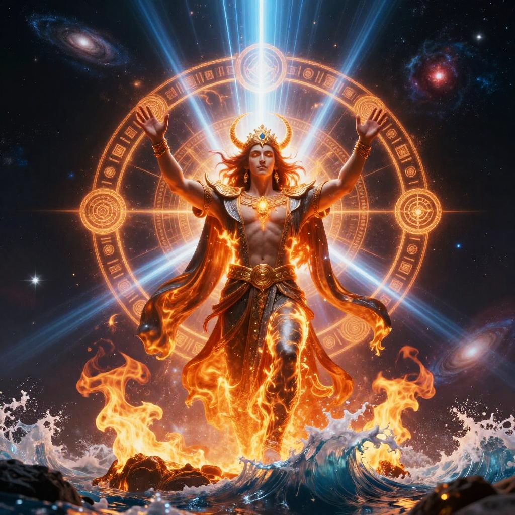 Digital artwork of a fiery, muscular god with horns, standing in waves, arms raised, surrounded by celestial symbols and beams, with a radiant, glowing