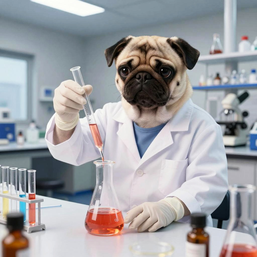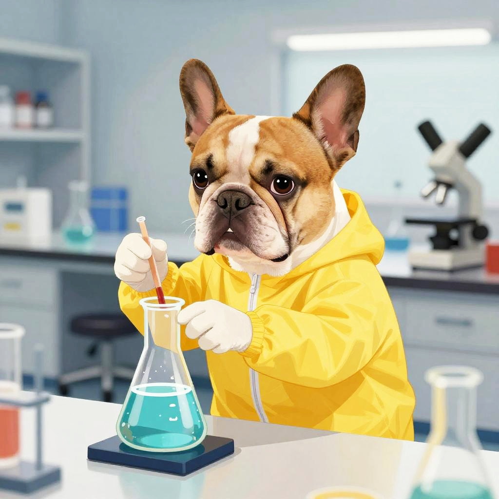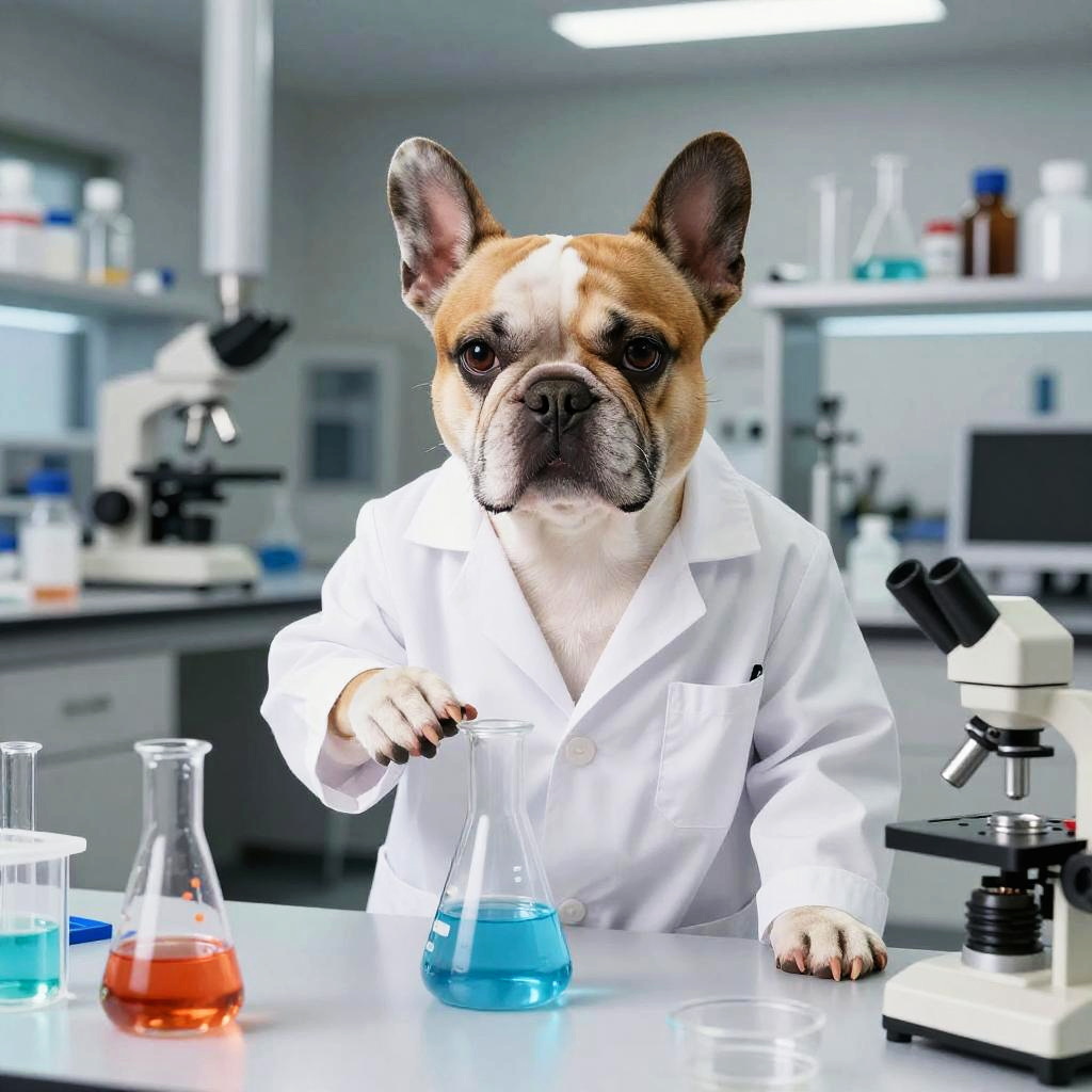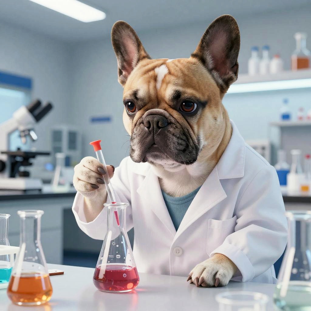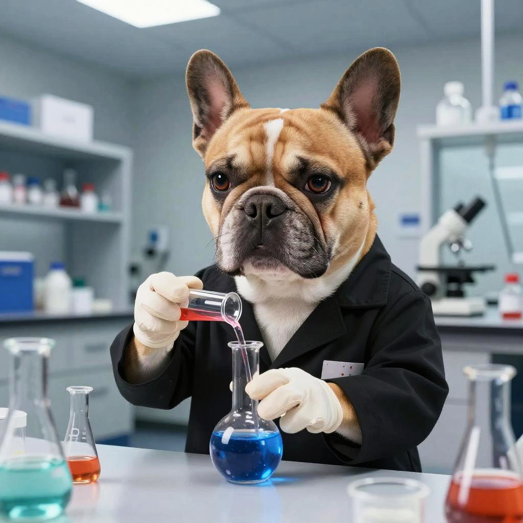 French Bulldog analyzing chemical samples in a blue lab coat and safety goggles in a clinical lab environment, highly detailed, humorous, digital painting