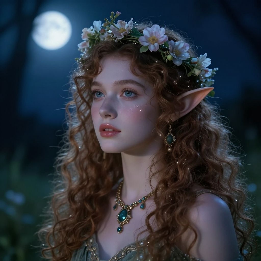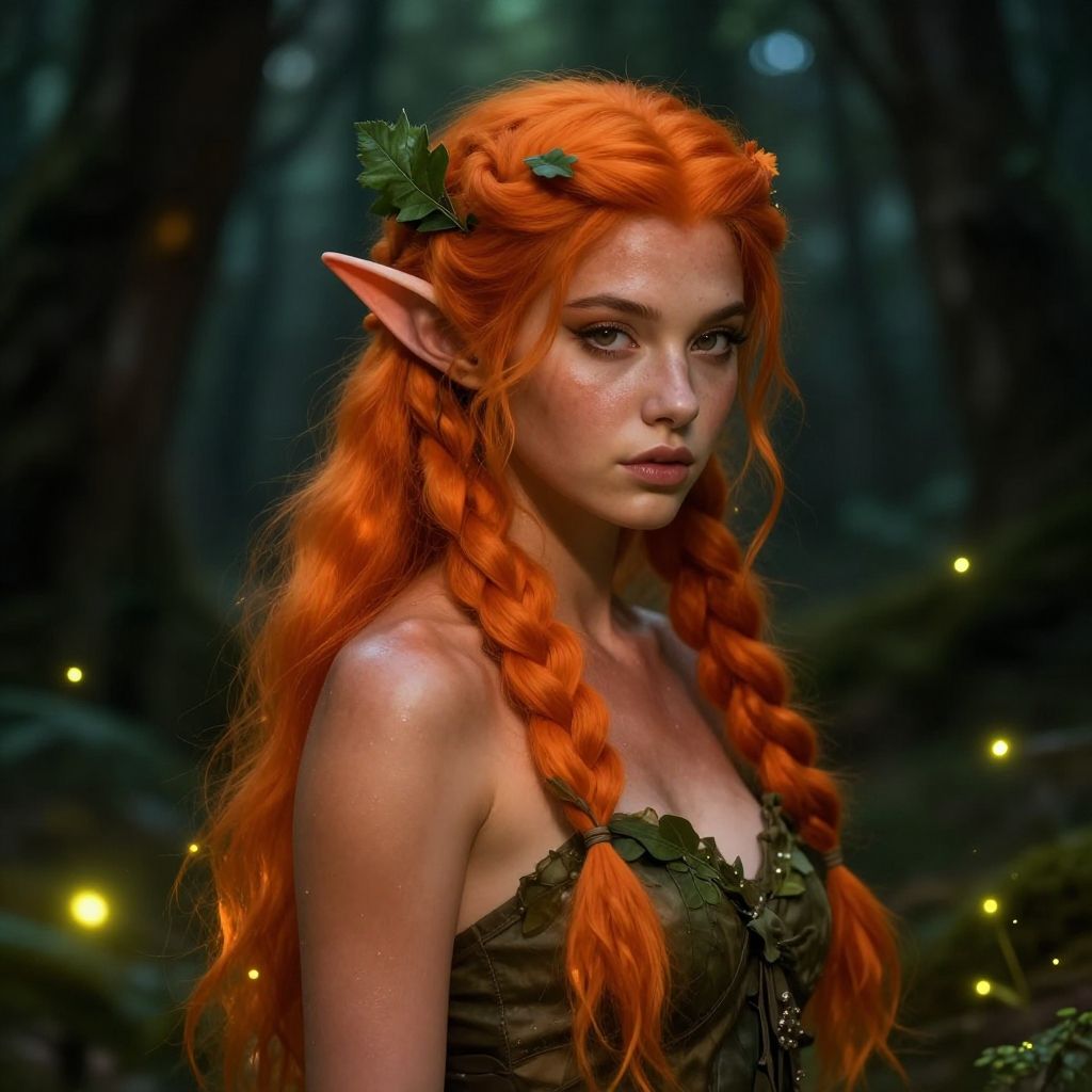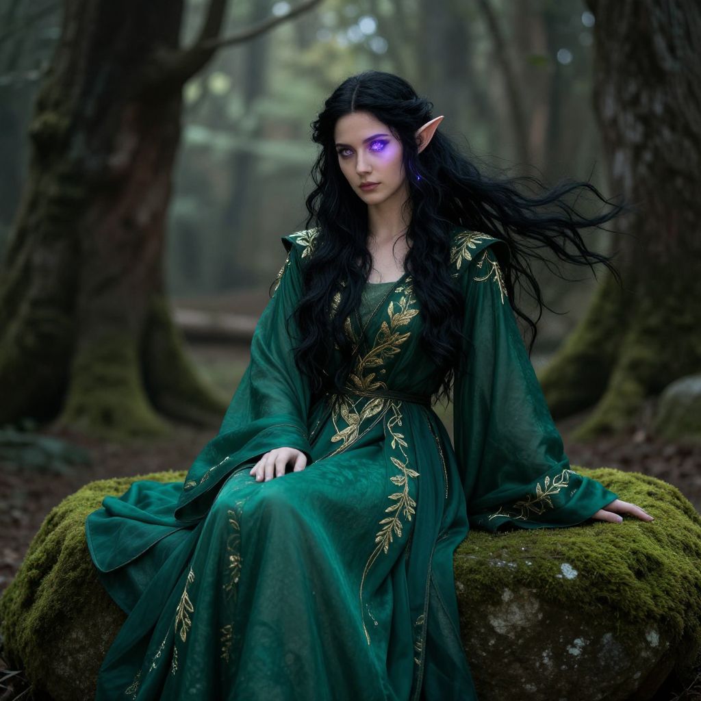Photograph-style digital artwork of a fair-skinned, elven woman with pointed ears, long brown hair, wearing a green, sleeveless dress,