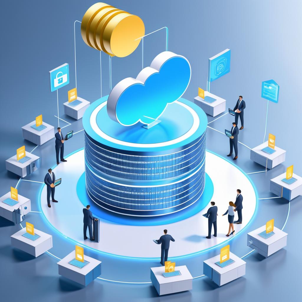 Contraption Teamwork in preserving corporate and sensitive information, using secure cloud storage and adhering to company guidelines. Department managers ensuring compliance, and employees demonstrating responsibility and professionalism, 3d,