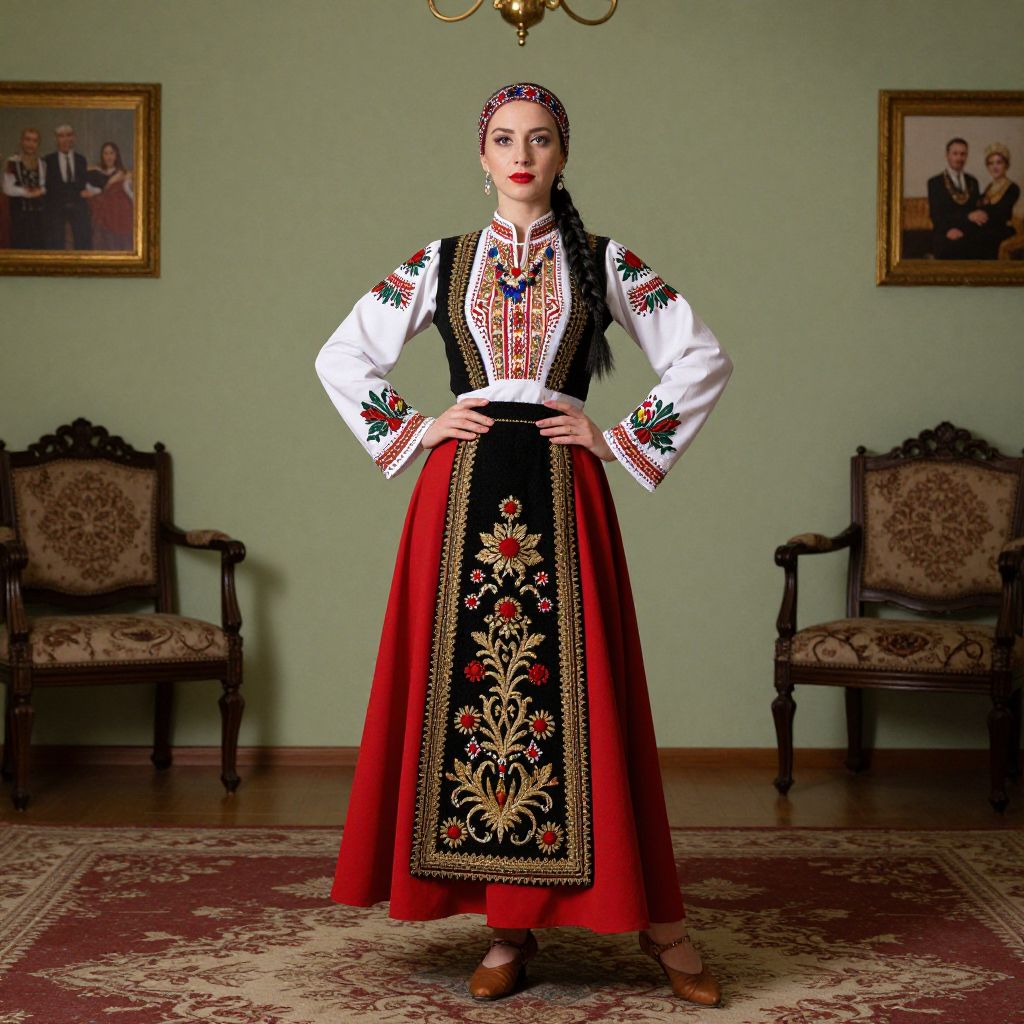 Photograph of a woman in traditional Eastern European folk attire, standing in a room with green walls, ornate chairs, and framed portraits.