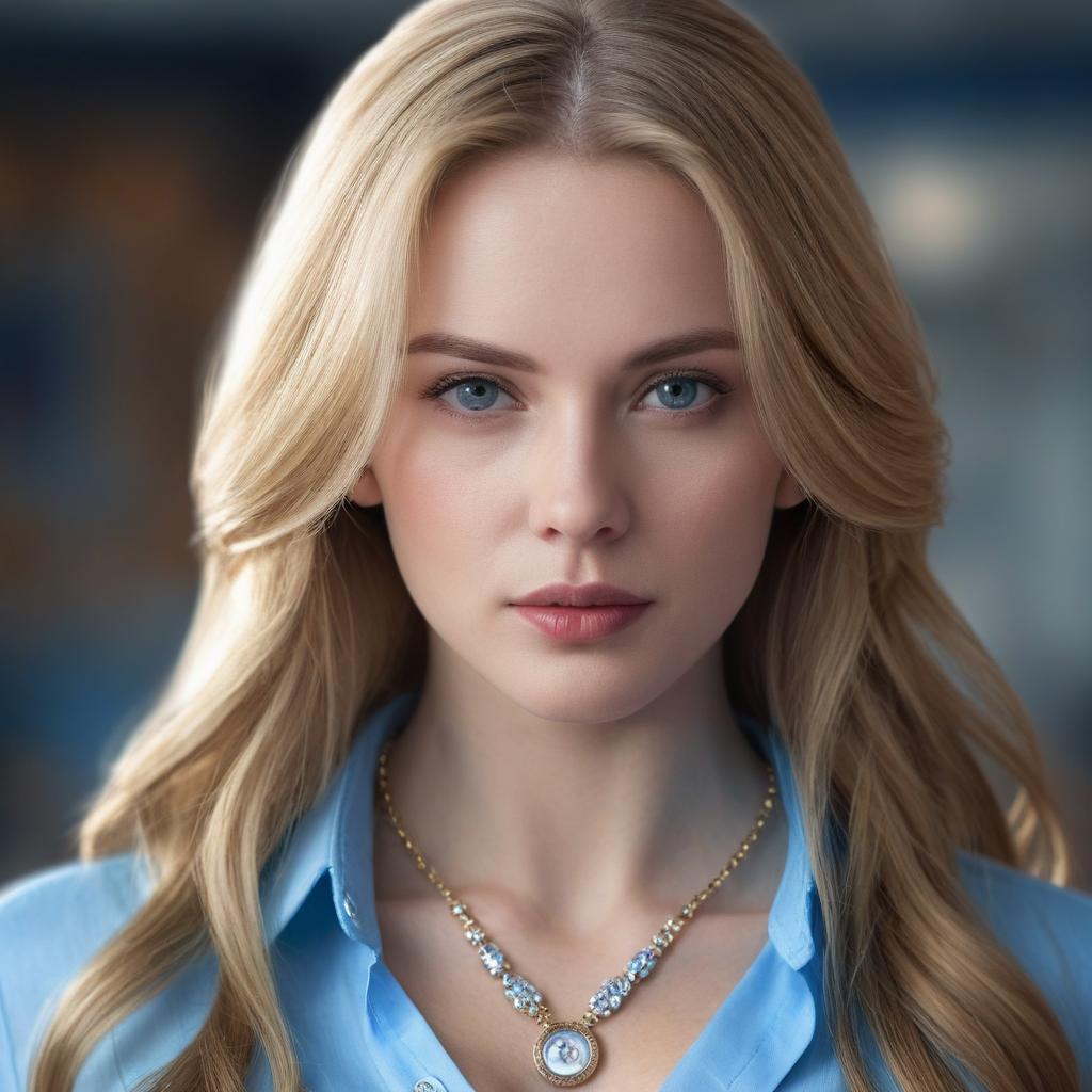 Close-up portrait of a blonde woman with long hair, blue eyes, and subtle makeup. She is wearing a light blue, partially unbuttoned shirt and a gold necklace with blue gemstones. The background is softly blurred, highlighting her facial features and jewelry.