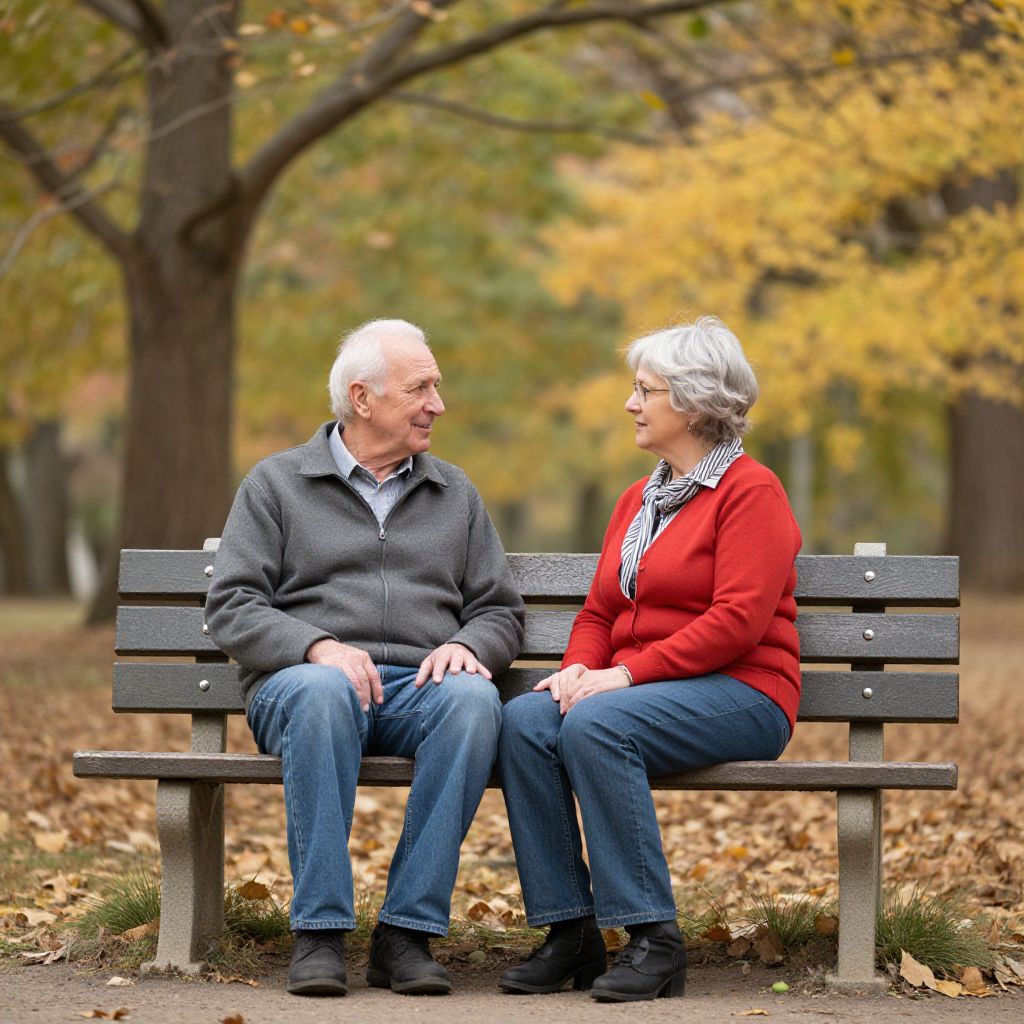 Photograph of an elderly couple with white hair, sitting on a wooden bench in a park with autumn foliage, smiling at each other. Both wear casual