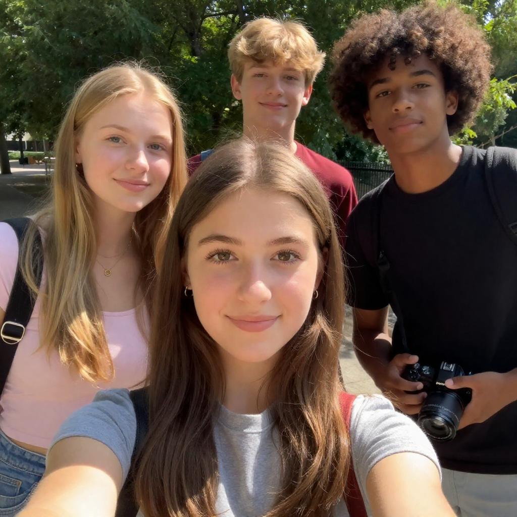 Photograph of four teenagers outdoors. A white girl with brown hair in a gray shirt takes a selfie in the foreground. Behind her, a blonde girl with long hair and a pink top, a blond boy in a red shirt, and a black boy with curly hair and a black shirt, holding a camera, stand closely. Bright sunlight and green trees in the background.
