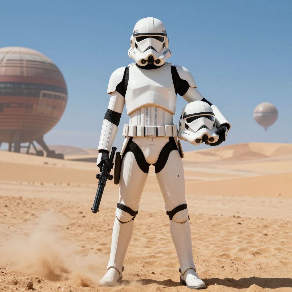 Star Wars female clone trooper standing on desert planet, blaster rifle ready, helmet under arm, dusty environment, heroic stance, vibrant sci-fi colors