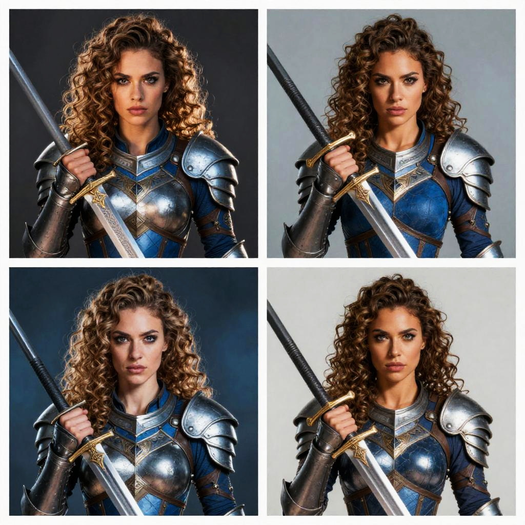 Photograph collage of a Caucasian woman with curly brown hair, wearing shiny blue and silver medieval-style armor, holding a sword with both hands in four different poses. Her armor features intricate metalwork and she has a determined expression. The background is a gradient from dark to light gray, highlighting her intense gaze and the reflective surfaces of her armor. The image is composed of four square sections, each showing a close-up of her upper body and face, emphasizing her strong, warrior-like presence. The lighting accentuates the metallic textures and her focused expression.