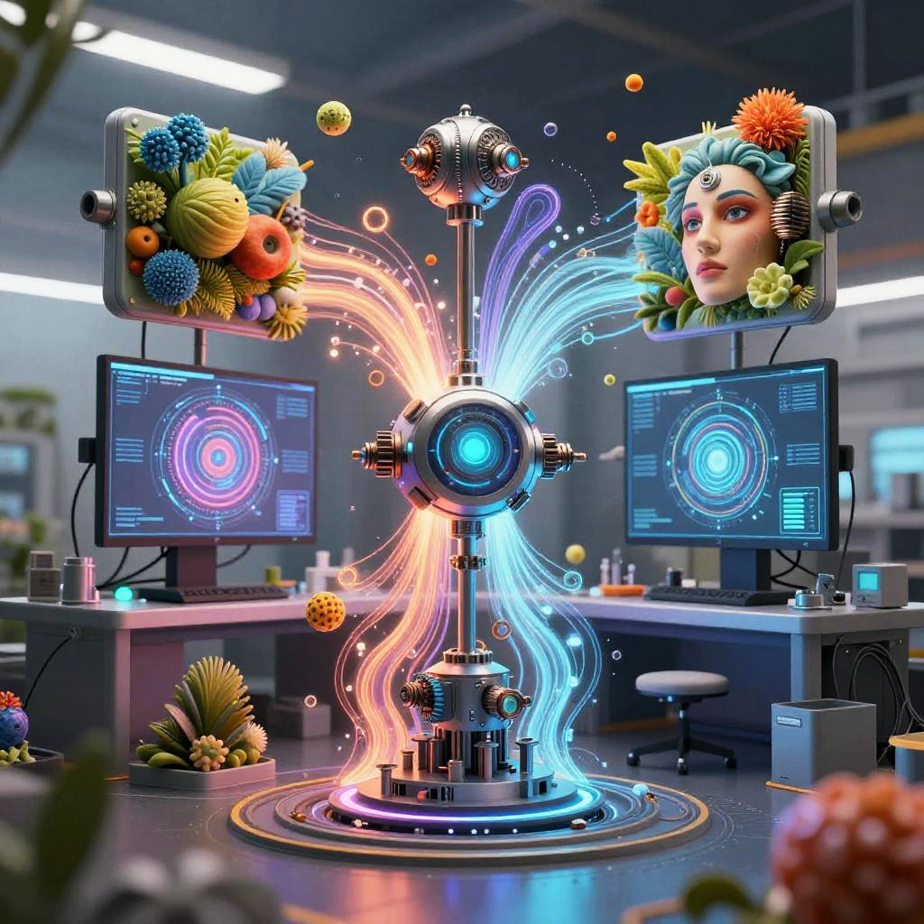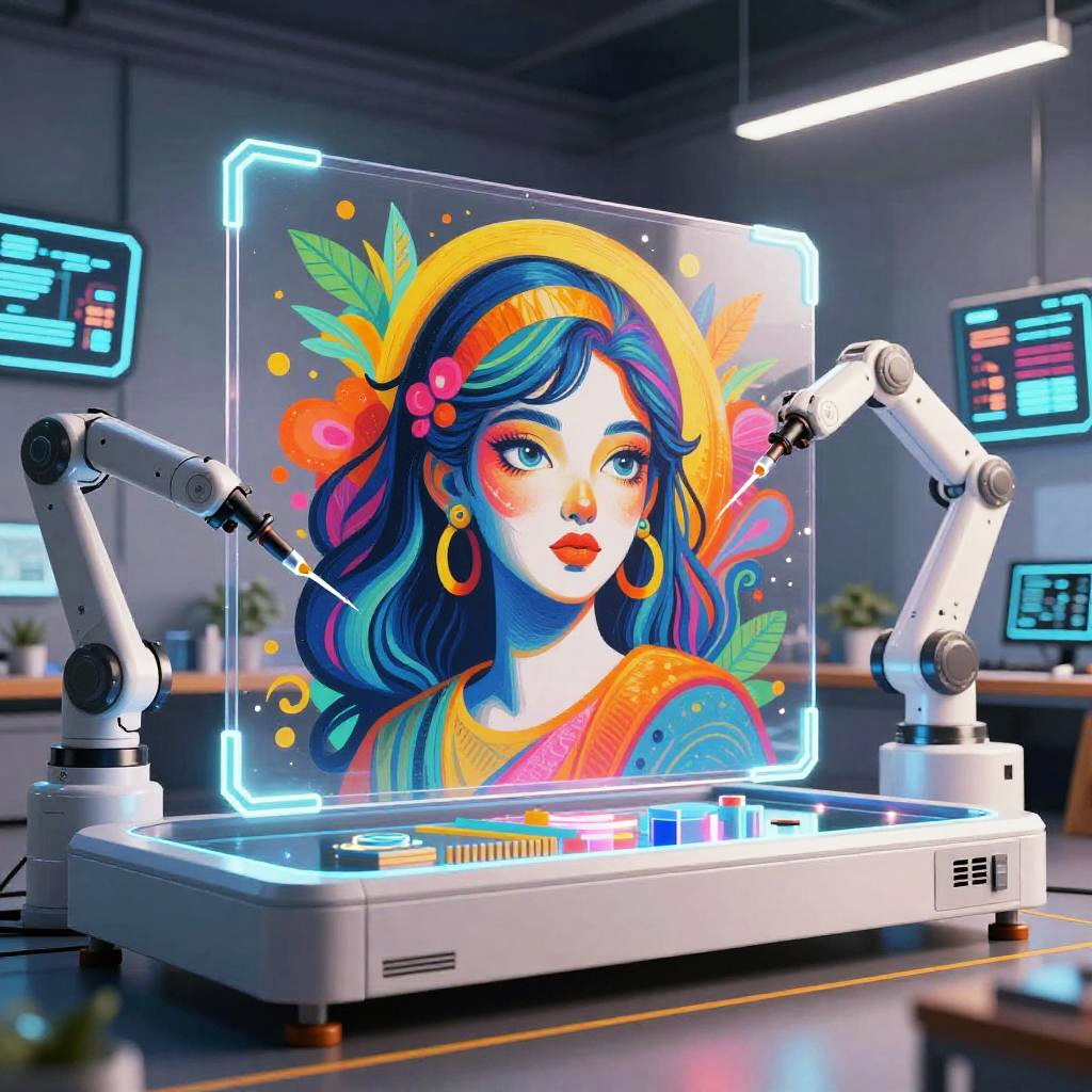 Ai generate pic featuring an AI-powered art machine creating a colorful mural on a transparent virtual canvas, set in a high-tech studio with robotic arms and glowing interface panels, dynamic composition, bright palette
