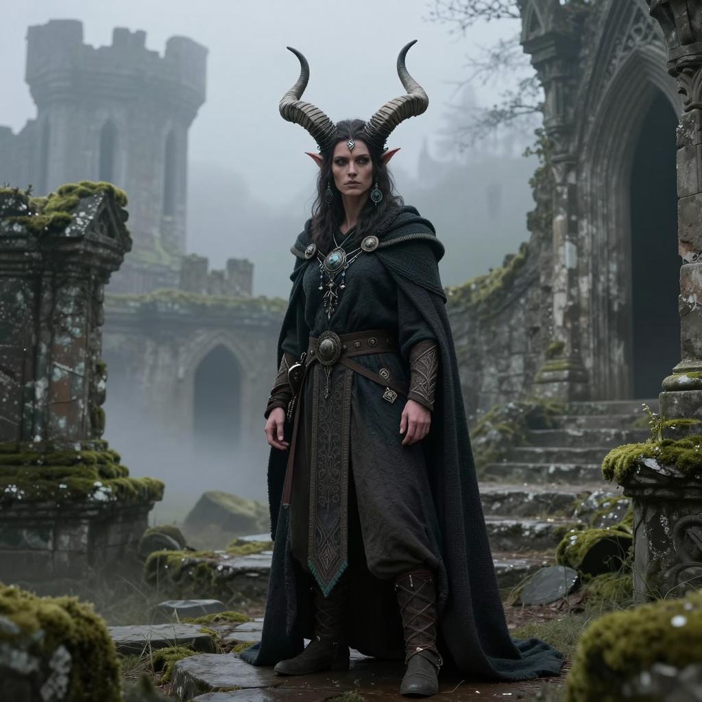 Sketchbook Fantasy realism, dungeons and dragons, pale gray skinned tiefling young woman, white ram horns, silver wavy hair, gaunt, black cloak, dim lighting, forest scenery, mysterious by Marta Bevacqu,