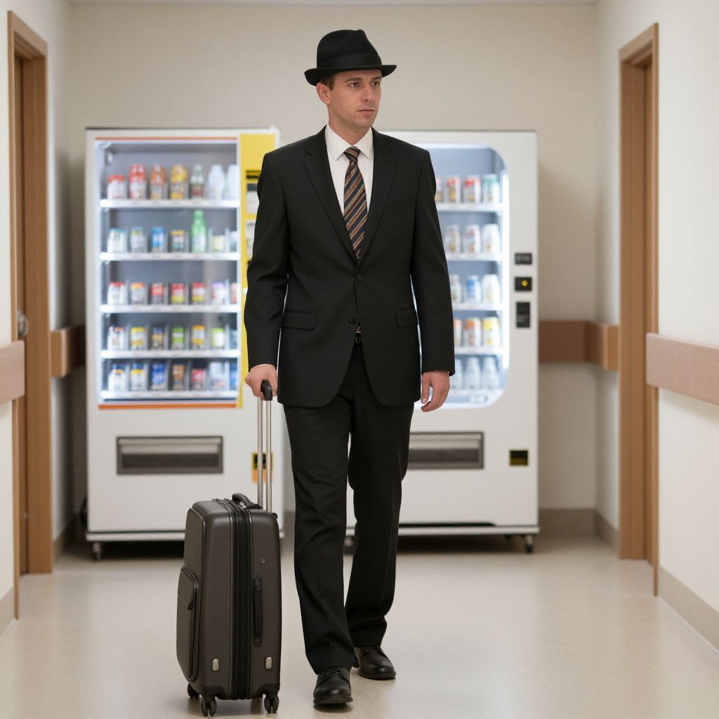 A man in a hat and suit stands in a hospital hallway, pulling a suitcase, with a vintage vending machine in the background.