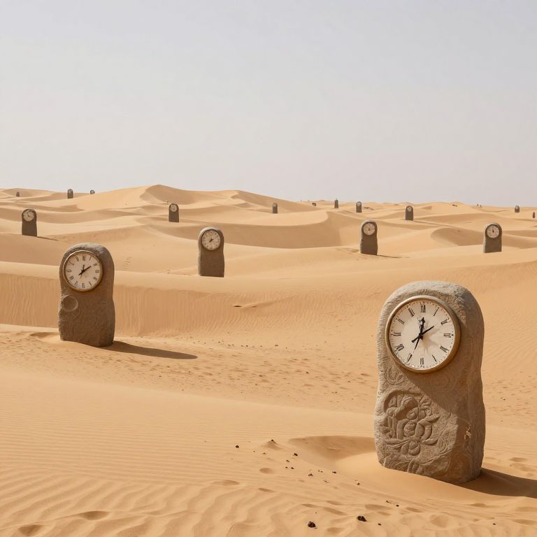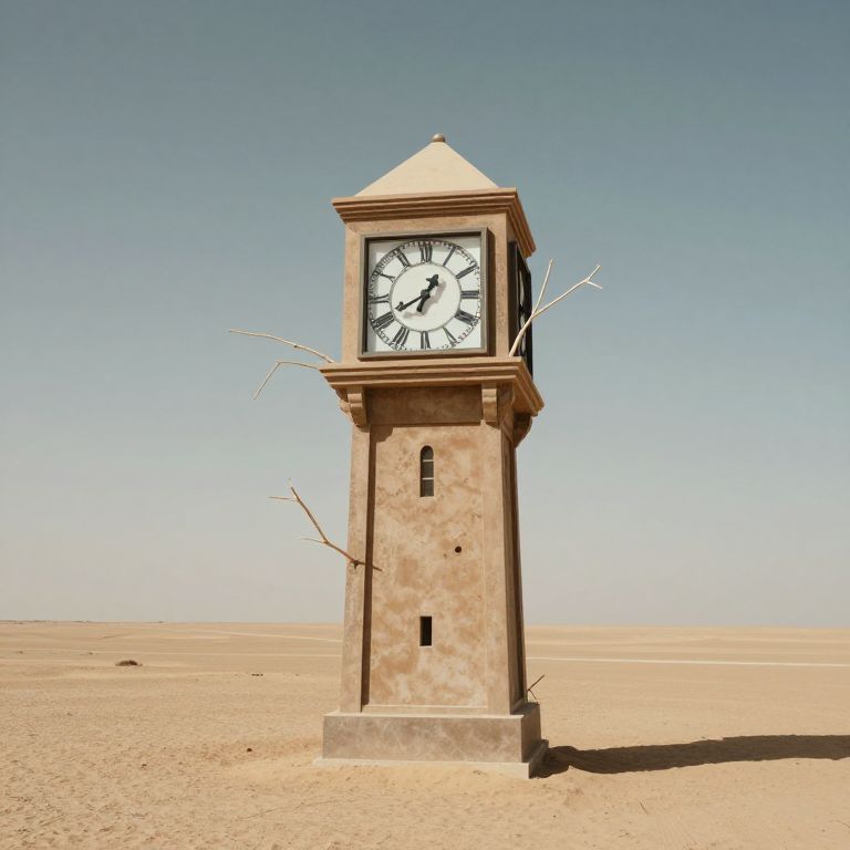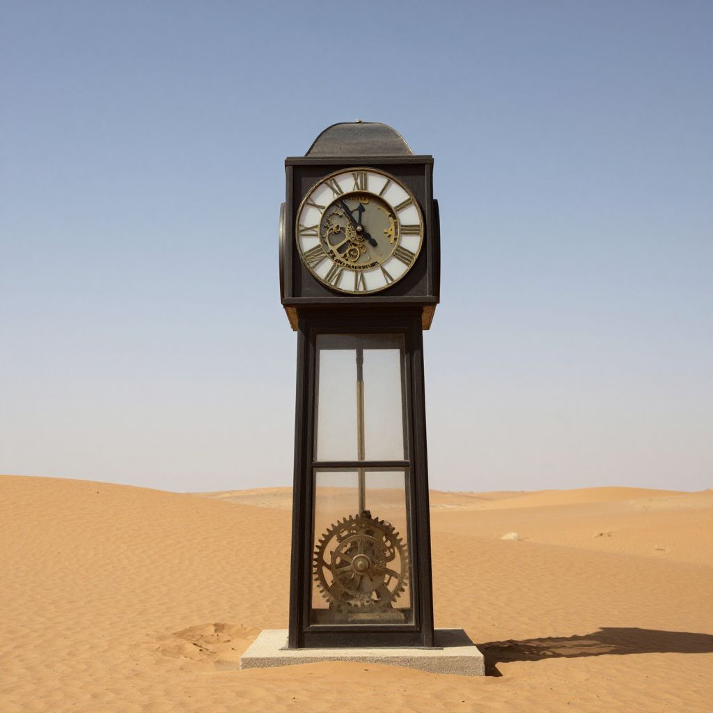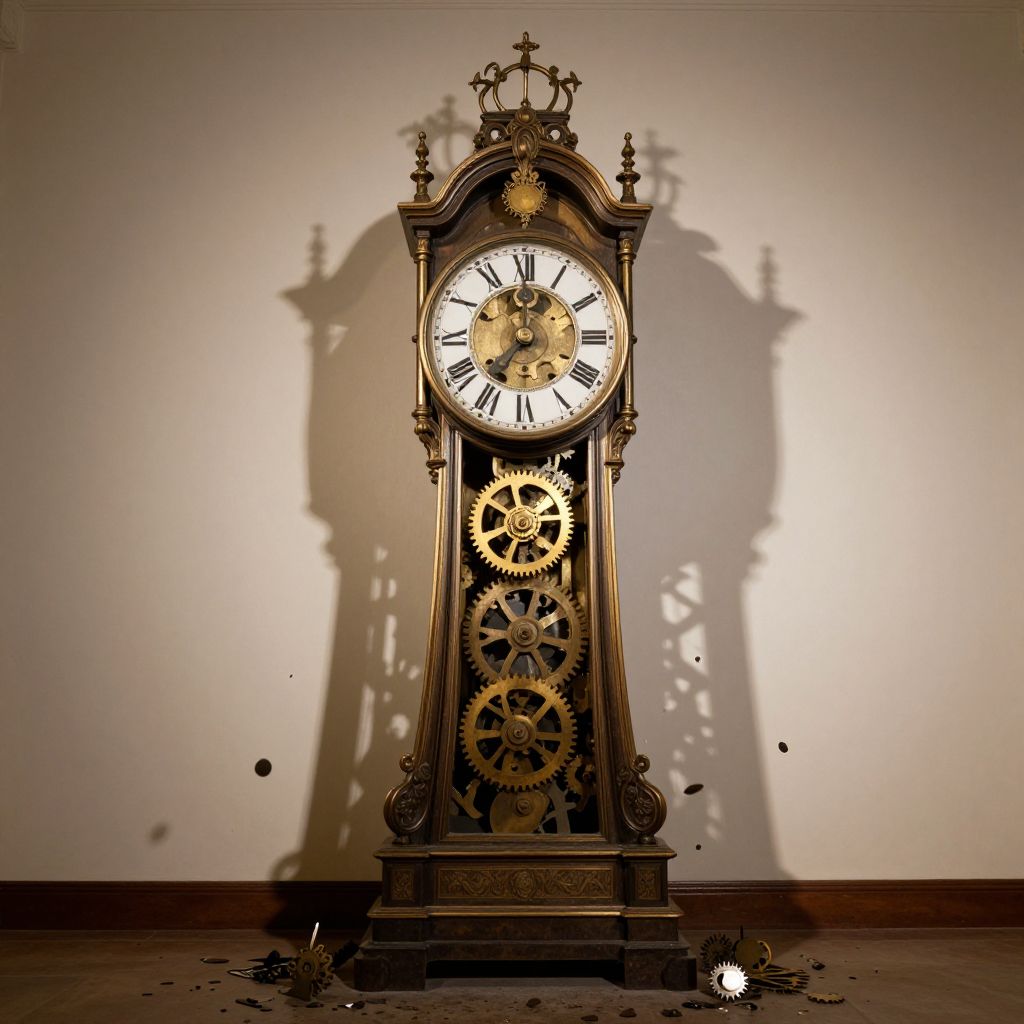 Surreal clock tower stands amidst a desolate landscape, its two faces adorned with Roman numerals, while intricate gears and cogs float in reverse motion around it, creating an illusion of time unraveling like threads through an invisible spool against a backdrop of scattered debris and distant hills.