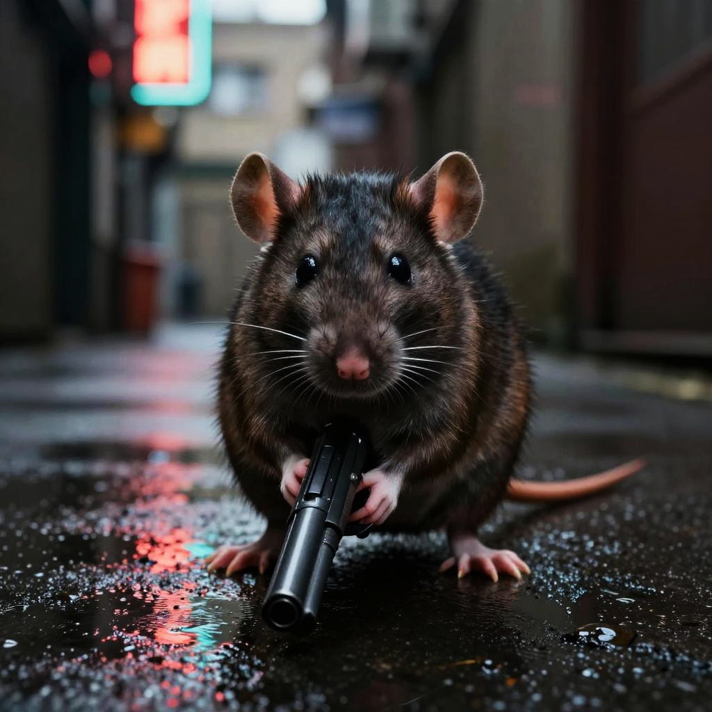 Photograph of a realistic, dark-furred rat with large black eyes, standing on a wet, reflective urban street. The rat holds a black handgun in its small front paws. The background is blurred but shows dimly lit, narrow alleyways with a neon red and blue sign on the left. The street surface is shiny with scattered water droplets, adding a gritty, urban vibe. The rat's pink ears and tail contrast with its dark fur, and its whiskers are clearly visible. The image combines elements of realism and surrealism, creating an unexpected and intense scene.