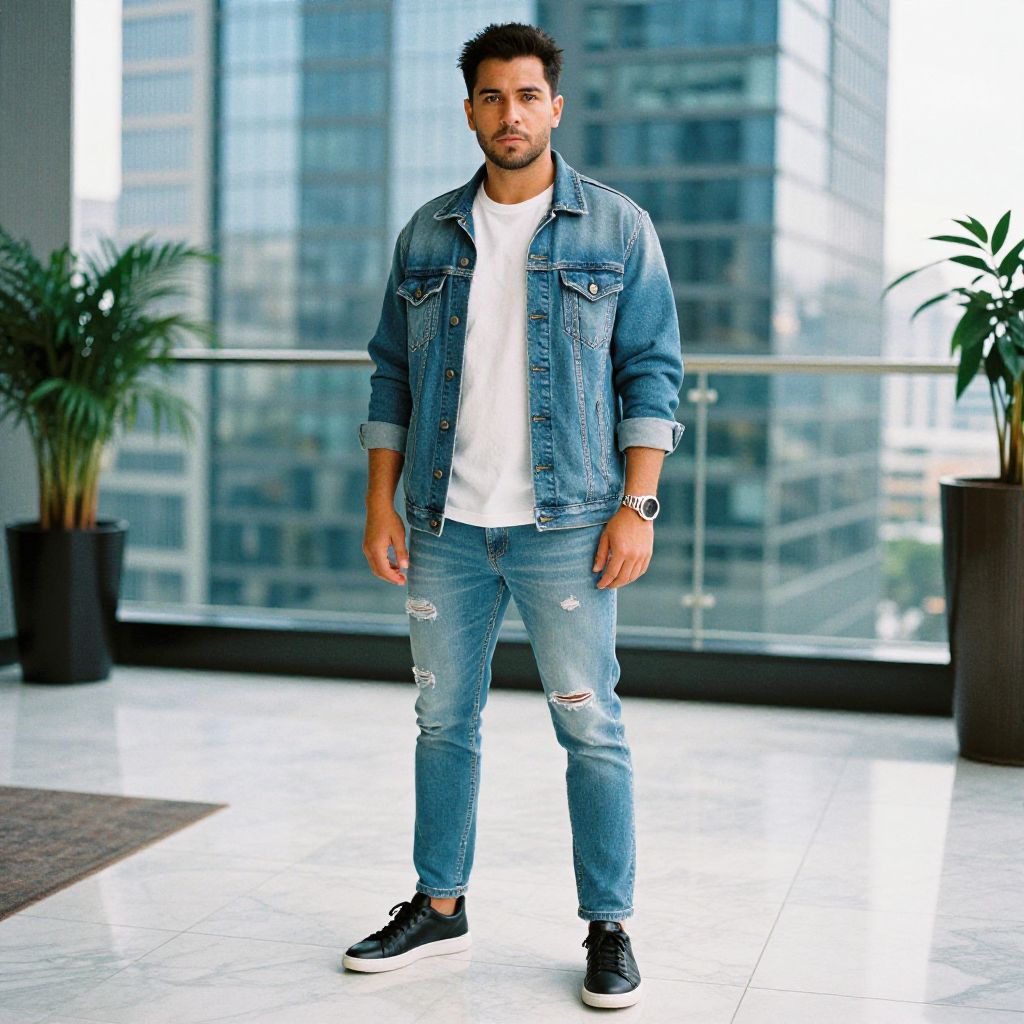 A man, slim-fit distressed jeans, white cotton crew neck t-shirt, oversized denim jacket, black leather sneakers, minimalistic silver watch, modern glass skyscraper, sleek lobby with marble floors, technicolor analog film stock, confident expression, vibrant colors, soft focus. Man has masculine face and piercing eyes