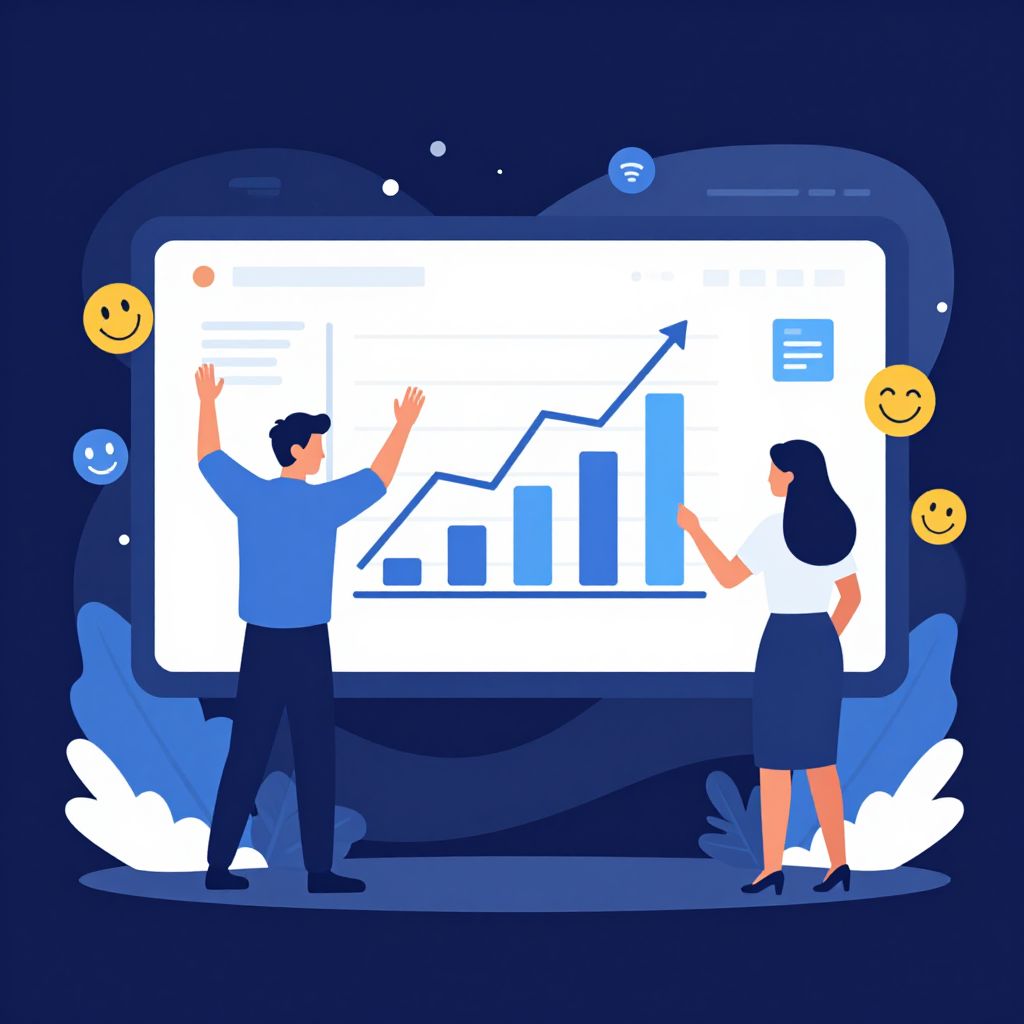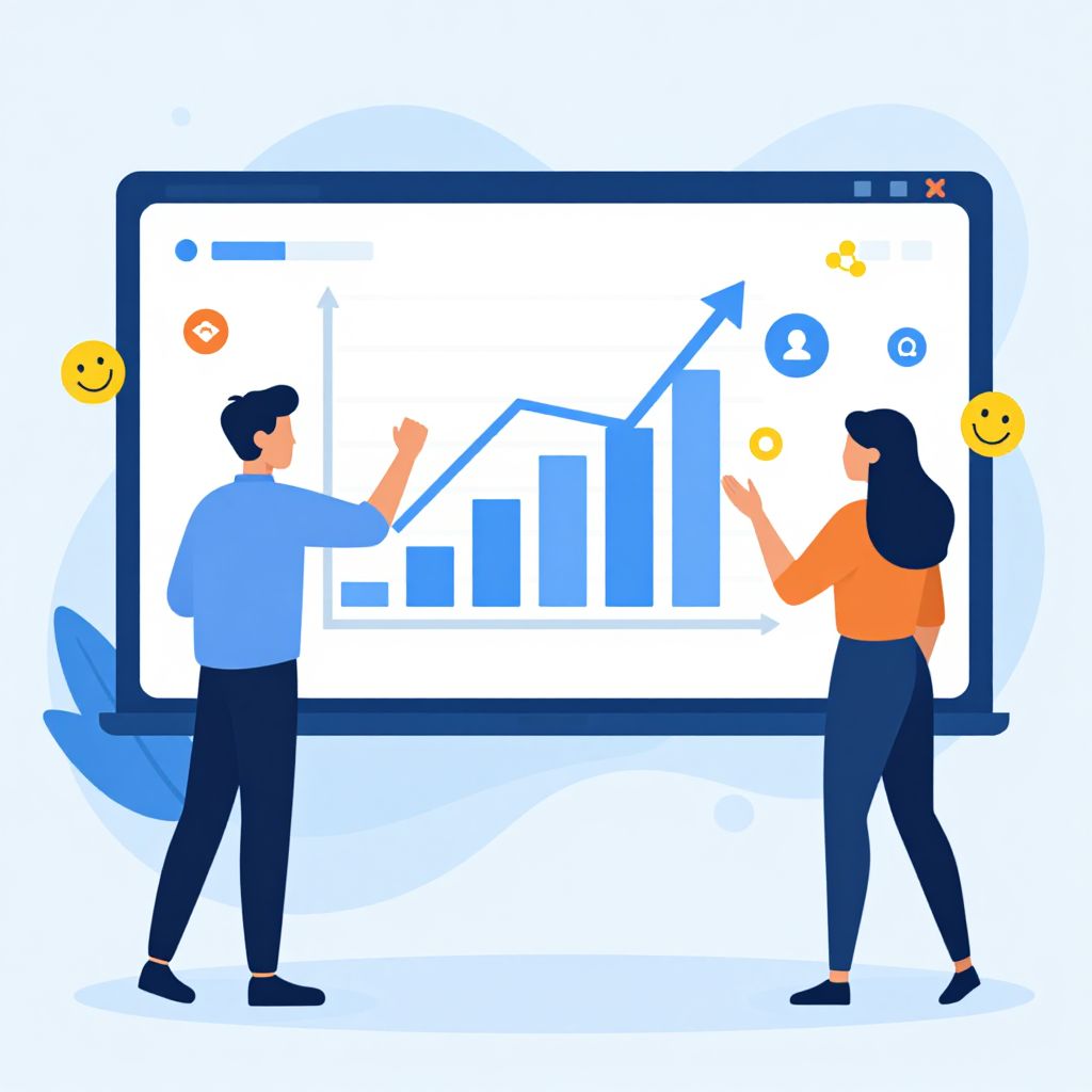 A vibrant vector art illustration depicts a professional presentation scene where a man gestures enthusiastically behind a large screen displaying a rising graph, while a woman interacts with the display, surrounded by floating icons and smiley faces, symbolizing engagement and success in inbound marketing efforts.