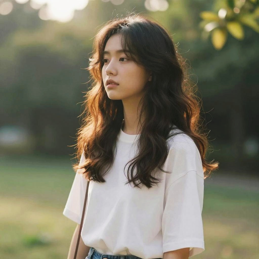 Wavy Blowout hairstyle on young woman, wearing casual outfit, in garden, captured in fashion editorial style with soft morning light.