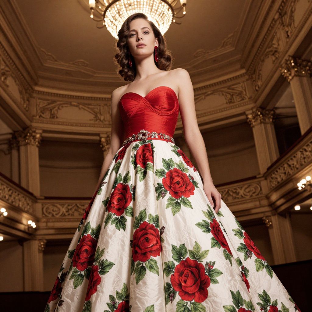 Photograph of a brunette woman with wavy hair, wearing a strapless, red satin corset with a sweetheart neckline, and a voluminous, white skirt adorned with large red roses and green leaves. She stands confidently in an opulent, grand ballroom with ornate, golden chandeliers and intricate moldings on the walls. The warm lighting enhances the rich colors of her dress and the elegant atmosphere of the room. Her expression is poised, and she gazes slightly downward. The overall style is classic and glamorous, evoking a sense of vintage elegance.
