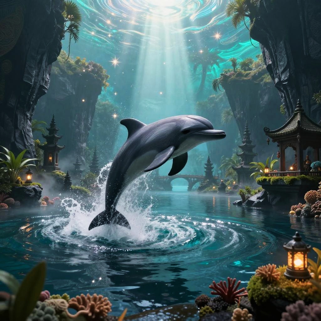 A grand stone dolphin leaping from swirling ocean whirlpool set within tropical archipelago guarded by black basalt cliffs and coral reefs, wrapped in ethereal mist and drifting incense, glowing stars scattered above, a celestial vault painted with vivid aquamarine and cyan streaked with brilliant sunlight shafts. Tranquil waters mirror the heavens, distant spires and bridges on rocky arches, lantern-lit sanctuaries and mossy terraces, a serene dreamlike atmosphere with surreal, intricate details; cinematic composition, volumetric fog and light rays, hyper-detailed textures, high dynamic range, wide-angle vista, depth of field, soft rim light, subtle film grain, epic scale.