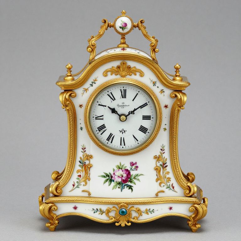 Exquisite Meissen porcelain mantel clock with ornate ormolu detailing, featuring hand-painted floral motifs and intricate gold embellishments, crafted by Kaendler in 1770.