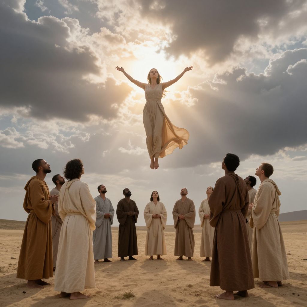 A woman in a flowing beige dress floats gracefully above a circle of robed figures, her arms outstretched toward a radiant sunburst piercing through dramatic clouds as they stand in awe on a sandy ground, their expressions filled with reverence and wonder.
