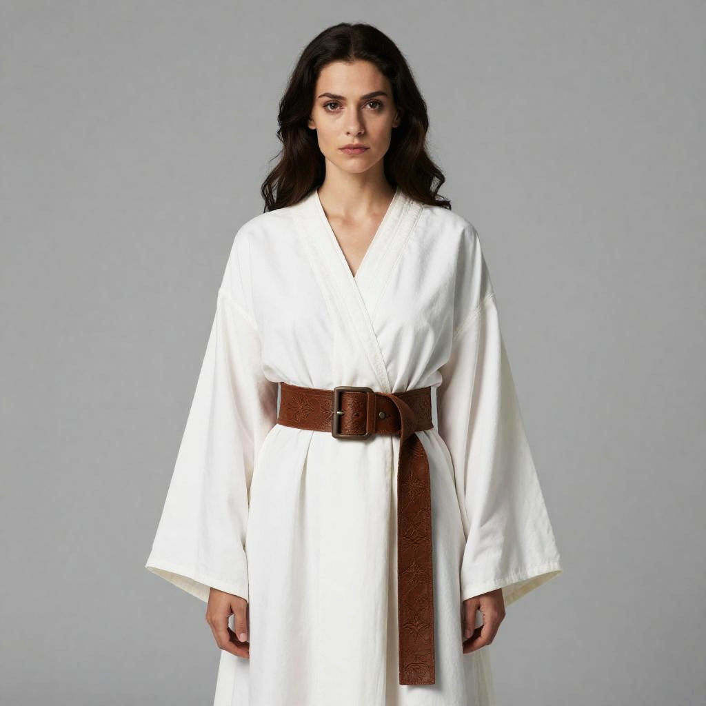 Supernatural Dress, woman in a white robe and a brown belt